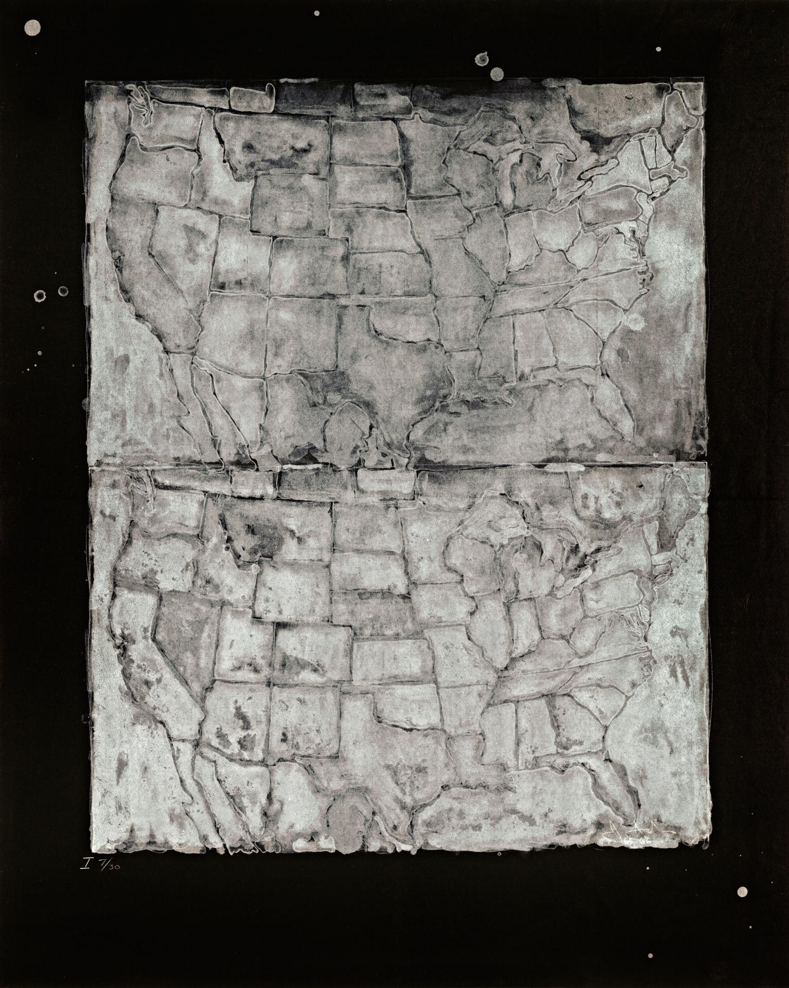 By the early 1960s Jasper Johns had introduced a new subject matter of mundane, everyday objects into American art. In his first solo show in New York in 1958, he presented a formidable series of paintings of flags, targets, numbers and alphabets. Puzzling critics and viewers alike with their commonplace subject matter and impersonal style, these works signalled the return of figuration in American art which in the previous decade had been dominated by Abstract Expressionism. In 1960 Johns added to his repertoire of subjects the motif of the map of North America. This was to become one of his signature images which he reworked in a series of paintings between 1961–63 and in two lithographs, executed in 1965–6, Two maps land
