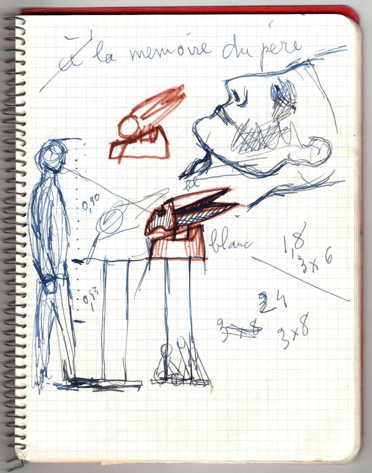 The central figure of the son in Death of the father is a deliberate self-portrait of the artist, weighed down by the tools of his sculptural trade, placed like a yoke on either side of his neck. A page from a sketchbook Ipoustéguy worked in during the gestation of Death of the father is inscribed ‘Porte le bonheur de ton oeuvre dans ton coeur. Son fardeau sur ses épaules’ (Carry the happiness of your work in your heart. His burden on his shoulders).21 Jean Ipoustéguy, Carnet rouge (Red sketchbook), 1967–68, Estate of Jean Ipoustéguy collection.