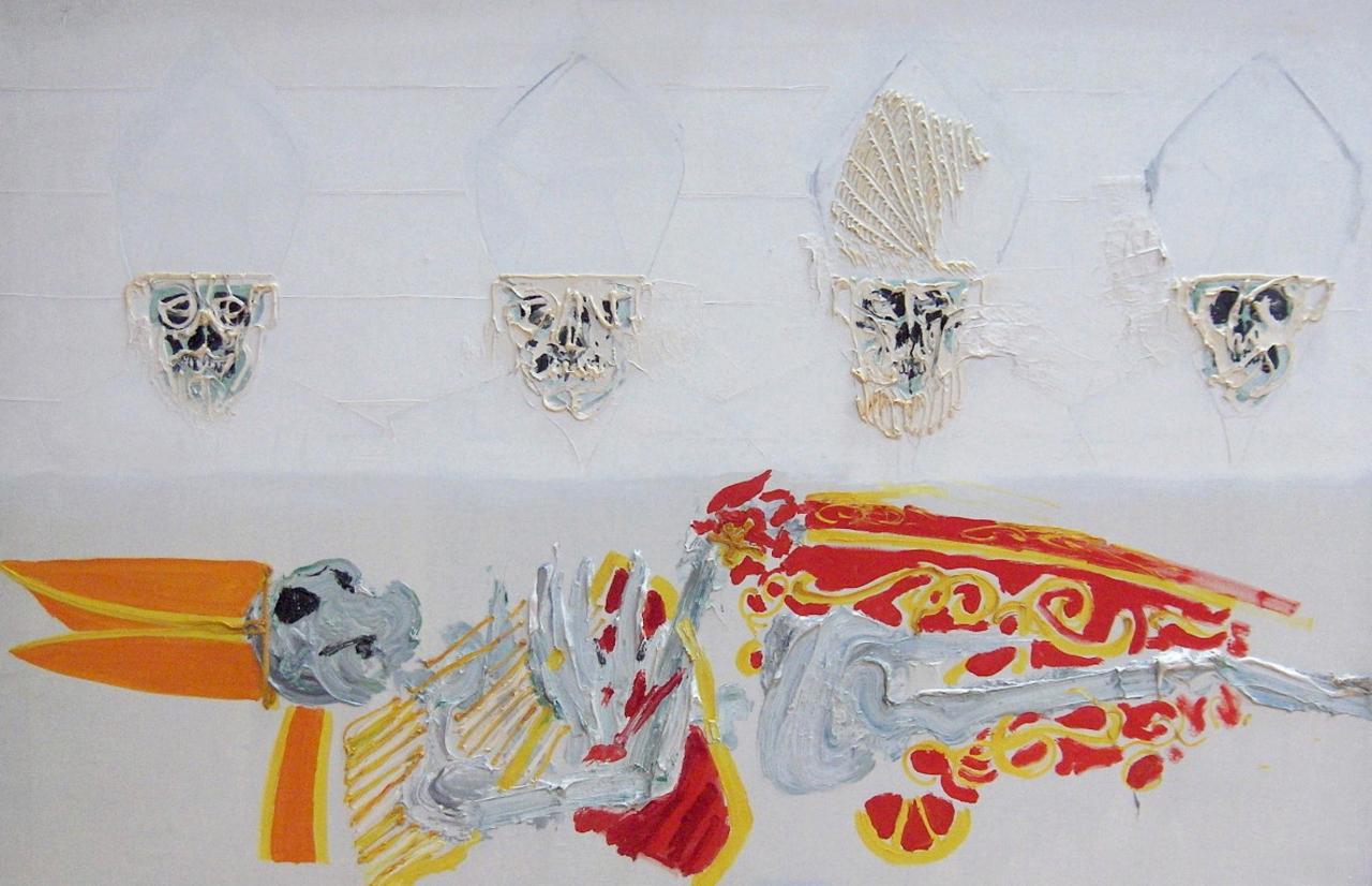 the father is lying on his back, his face and hands in silvered bronze, receiving the marmoreal presence of the son who, with a constraint around his neck, is suspended in an aggressive pose above him. He is surrounded by around ten mitred heads of popes, their faces compressed or disfigured, their skulls exposed.11 ibid., pp. 36, 38.