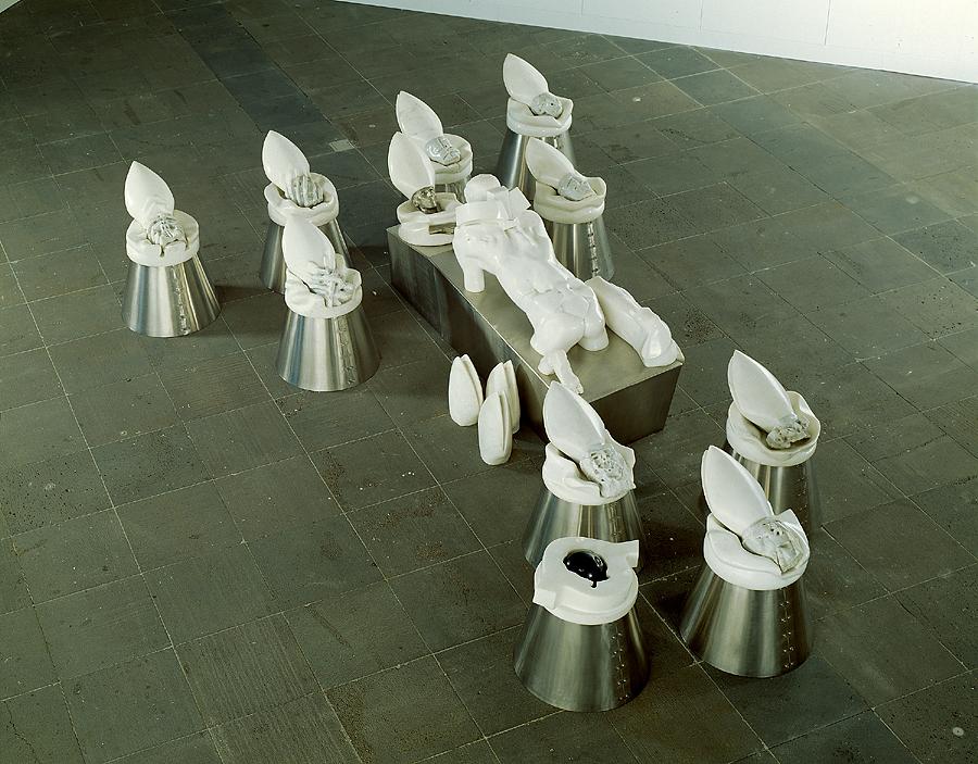 The central figure of the son is carved with Michelangesque gusto. He is shown crouching on his father’s coffin, whose cold metallic form resembles a mortuary operating table. He stares fixedly forward, towards the realistically rendered face and hands of the father, around whom irradiate a series of visages in progressive states of decomposition, the final of which is reduced to a dark steel perforated ball. With a nod to contemporary abstraction, these are situated upon smooth stainless-steel cones that are ‘sutured’ together, as if post-autopsy, below the neck. Their placement around the perimeter of the installation has been compared to the forms of pleurants (weepers), mourning figures that surrounded the central effigy of the deceased in fourteenth- and fifteenth-century Burgundian tomb monuments (a working sketch for the installation has its composition arranged in this manner). The repeated, gleaming mitres placed atop these skulls punctuate the piece like Baroque trumpet blasts.
