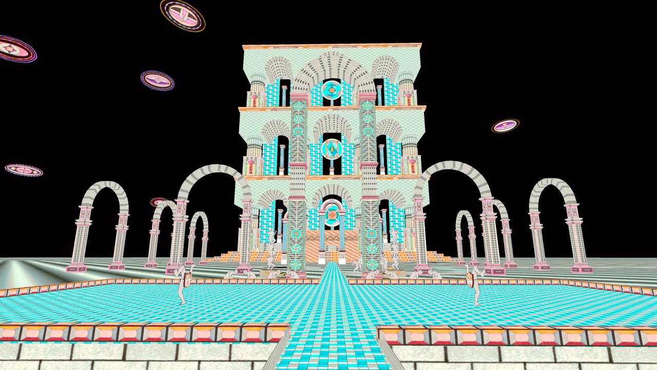 Viewed through Oculus Rift headsets, Ixian Gate (which includes the tessellated patterns, otherworldly figures and humanoids that recur across the artist’s oeuvre) takes the form of a ride, with viewers positioned on a virtual floor tile that moves them through the space. The experience is not easily described; it involves the body and how we inhabit it – or leave it – as we succumb to an immersive, 360-degree animated realm.