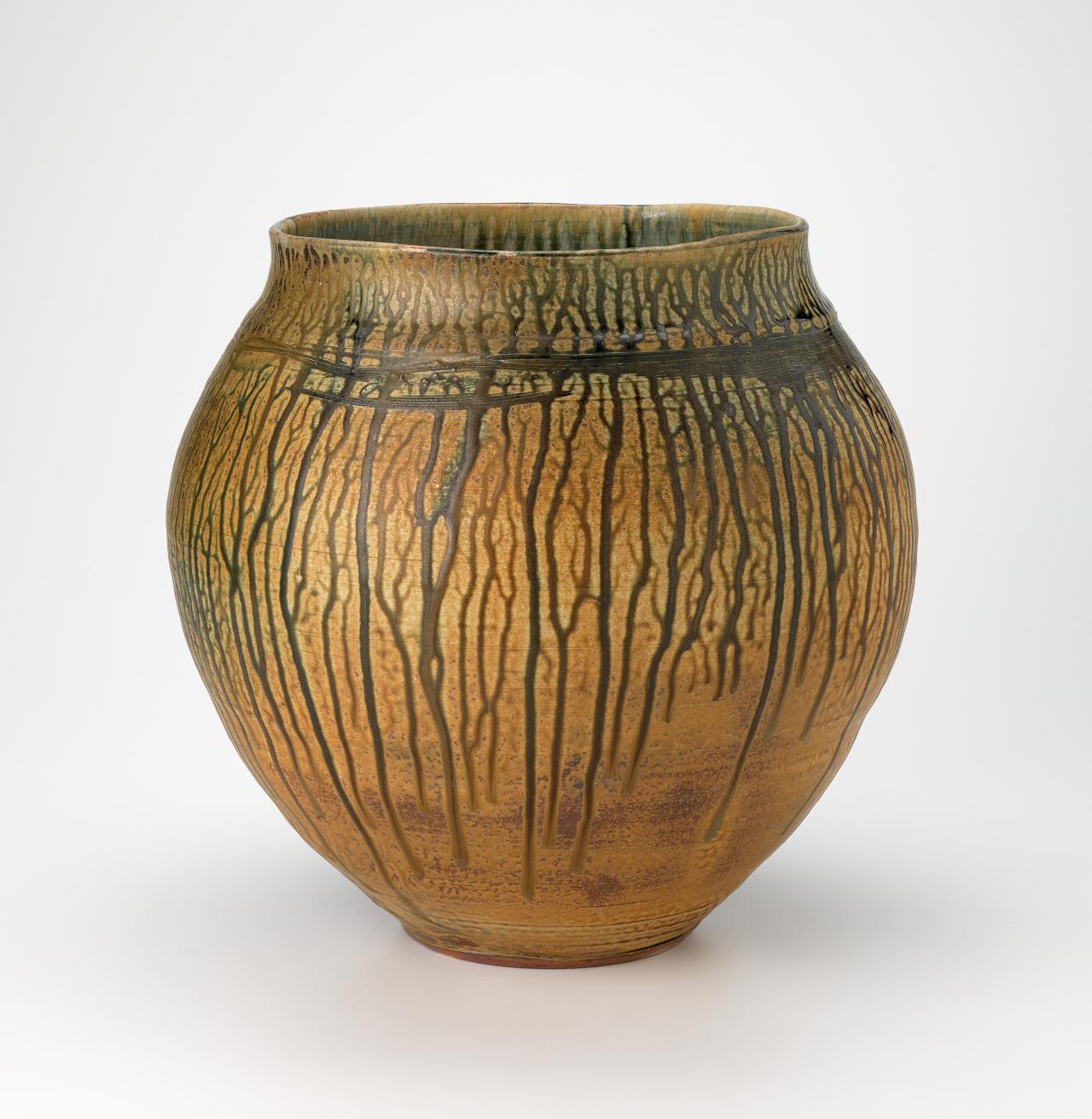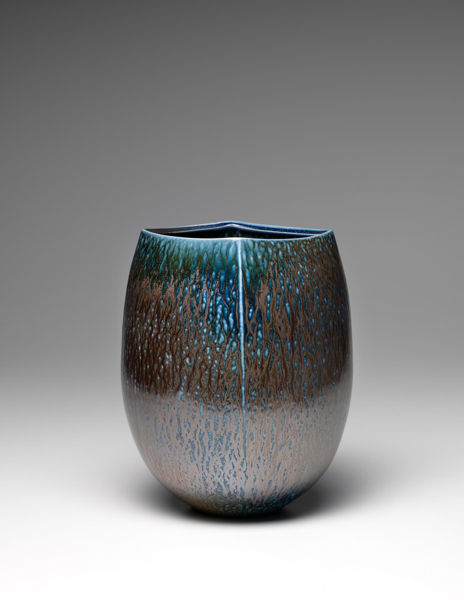 The salt immediately volatilises and the sodium in the salt reacts with the silica in the clay body to form a hard glassy coating. Dermer has taken this process, which was originally used as a cheap and effective way of glazing industrial wares such as clay sewer pipes and acid jars, to an extraordinary new level where the finished form acquires a deep, rich iridescence becoming a piece that is both visually and physically balanced and of jewel-like beauty.