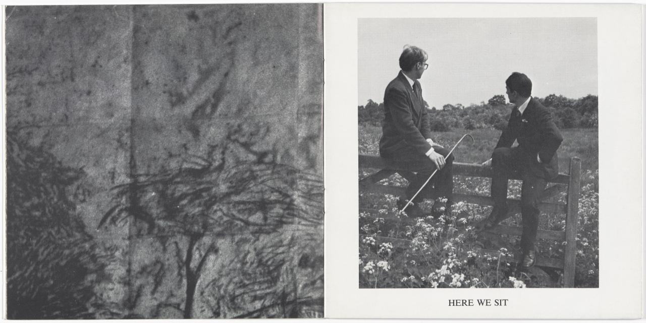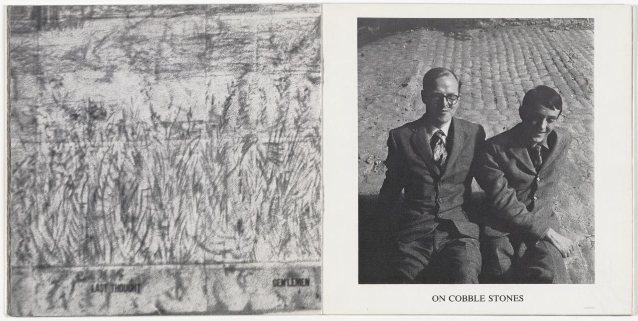 As with Szeemann’s Art Project, The singing sculpture was accompanied by a publication. Conceived and designed by the artists, it was presented as an artists’ book rather than an exhibition catalogue (fig. 8). This was in keeping with the many publications they had already made.42 Publications reprinted in McCall; and Forbat, p. 97. Noted by Baume, p. 29. It contained images from their twenty-three-part drawing The general jungle, 1971, imagining the artists in parkland settings and shown as part of their Sonnabend New York exhibition in 1971, alongside details from a large ‘charcoal on paper sculpture’ drawing, The shrubberies number 1 and number 2, 1972. These massive, floor-to-ceiling drawings again featured Gilbert & George walking through a bucolic landscape. Along the bottom ran a line of text, with phrases borrowed from the English gentleman sports of cricket and racing, such as ‘Well bowled’, contrasting with pub vernacular terms including ‘Bad blood’. These works on paper featured in both Australian venues, though little mention was made of them in their Australian context. This differed from the reception of previous showings of the The shrubberies overseas, where it was given pride of place in London’s Hayward Gallery exhibition The New Art (1972), and the artists also featured on the exhibition’s invitation card.