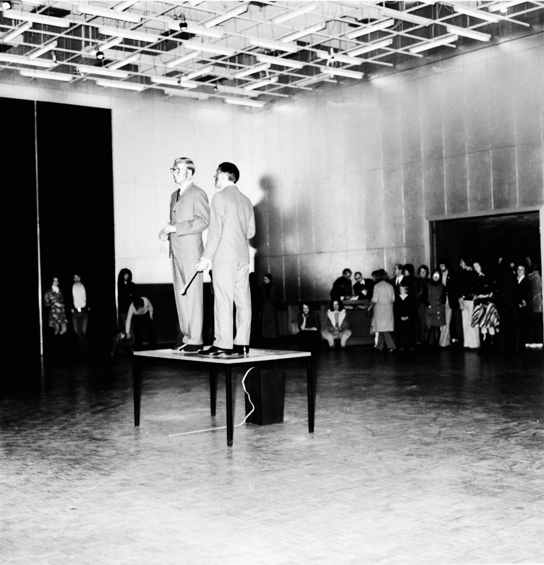British artists Gilbert & George (Gilbert Proesch and George Passmore) had achieved international notoriety as ‘living sculptures’ in 1969.35 Thomas Crow notes that the artists’ collective entity Gilbert & George evoked a double act from the archaic English music hall tradition, a reference that was further revealed by The singing sculpture. See Thomas Crow, The Rise of the Sixties: American and European Art in the Era of Dissent 1955–69, Lawrence King Publishing, London, 1996, p. 163. John Kaldor invited them to present their Singing sculpture in 1973 as John Kaldor Art Project 3. The singing sculpture and The shrubberies number I and number 2 were presented at the AGNSW, Sydney, on 16–21 August, and the NGV, Melbourne, on 29 August – 2 September 1973 (fig. 7).