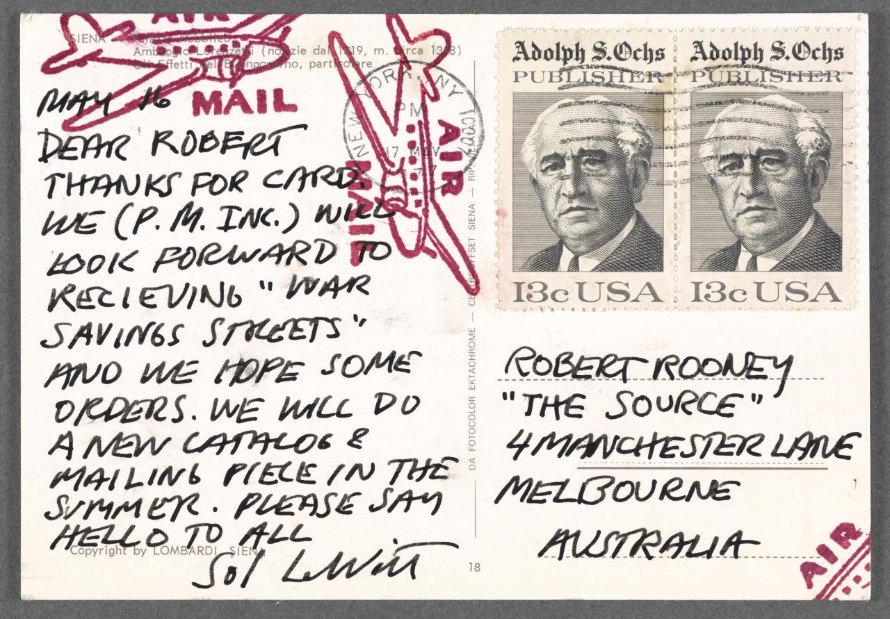 80 Peter Cripps, conversation with the author, 26 Aug. 2012. Cripps notes that he was unaware other artists in Melbourne were exchanging postcards with LeWitt at the time, and only discovered this when viewing other postcards to Rooney in Endless Present: Robert Rooney and Conceptual Art, NGV, 12 Nov. 2010 – 27 March 2011. Postcards from the correspondence between Rooney and LeWitt were also included in the collection show in the John Kaldor Family Galleries, AGNSW, in 2014.