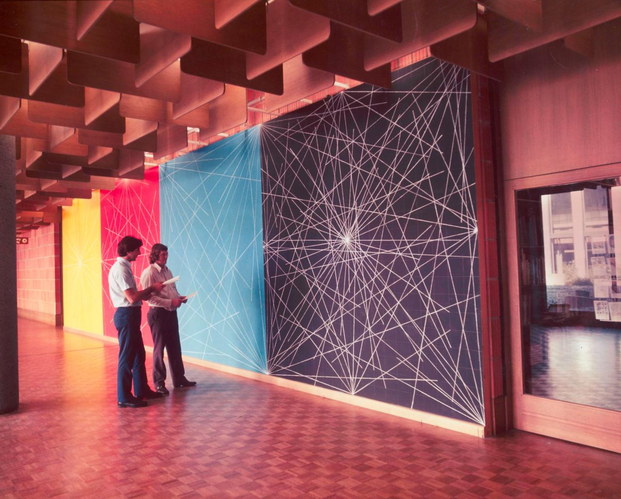 For the 1977 JKAP project, Sol LeWitt created a wall drawing: Wall drawing #146. All two part combinations of arcs from four corners and four sides, straight, not-straight and broken lines in four directions, 1972–77. It had already been installed a number of times overseas. Acquired by the Italian collector Count Giuseppe Panza di Biumino, permission was ‘lent’ to LeWitt for its temporary installation at the AGNSW.74 Daniel Thomas, in his article on LeWitt for The Bulletin, notes the artist’s relationship to the collector. See Daniel Thomas, ‘The master of the grid’, Bulletin, 2 April 1977, p. 69. LeWitt, Wall drawing #146. All two part combinations of arcs from four corners and four sides, straight, not-straight and broken lines in four directions, 1972–77, now forms part of the Solomon R. Guggenheim Museum, New York, Panza Collection, Gift 92.4160. By 1977 LeWitt’s wall drawings had been shown in leading museums worldwide.75 For a discussion of LeWitt’s wall drawings, see Rosalind Krauss, ‘The LeWitt matrix’, in Sol LeWitt: Structures 1962–1993, Museum of Modern Art, Oxford, 1993, pp. 25–33. He was widely collected.76 For an extensive bibliography of LeWitt’s solo and group shows, see Sol LeWitt, pp. 119–21. LeWitt was included in Szeemann’s When Attitude Becomes Form, Kunsthalle Bern, Switzerland (1969), while his renowned text ‘Paragraphs on conceptual art’ was published Artforum, 5, no. 10, June 1967, pp. 79–83, and reprinted in Gary Garrels (ed.), Sol LeWitt: a Retrospective, San Francisco Museum of Modern Art, in association with Yale University Press, San Francisco and New Haven, CT, 2000, p. 369. With each installation, the instructions varied in size and dimensions. No two works were exactly the same: at the AGNSW’s central space, he used the double height wall to join the old and new wings. Students from the Alexander Mackie College acted as LeWitt’s assistants.77 Baume, p. 38.
