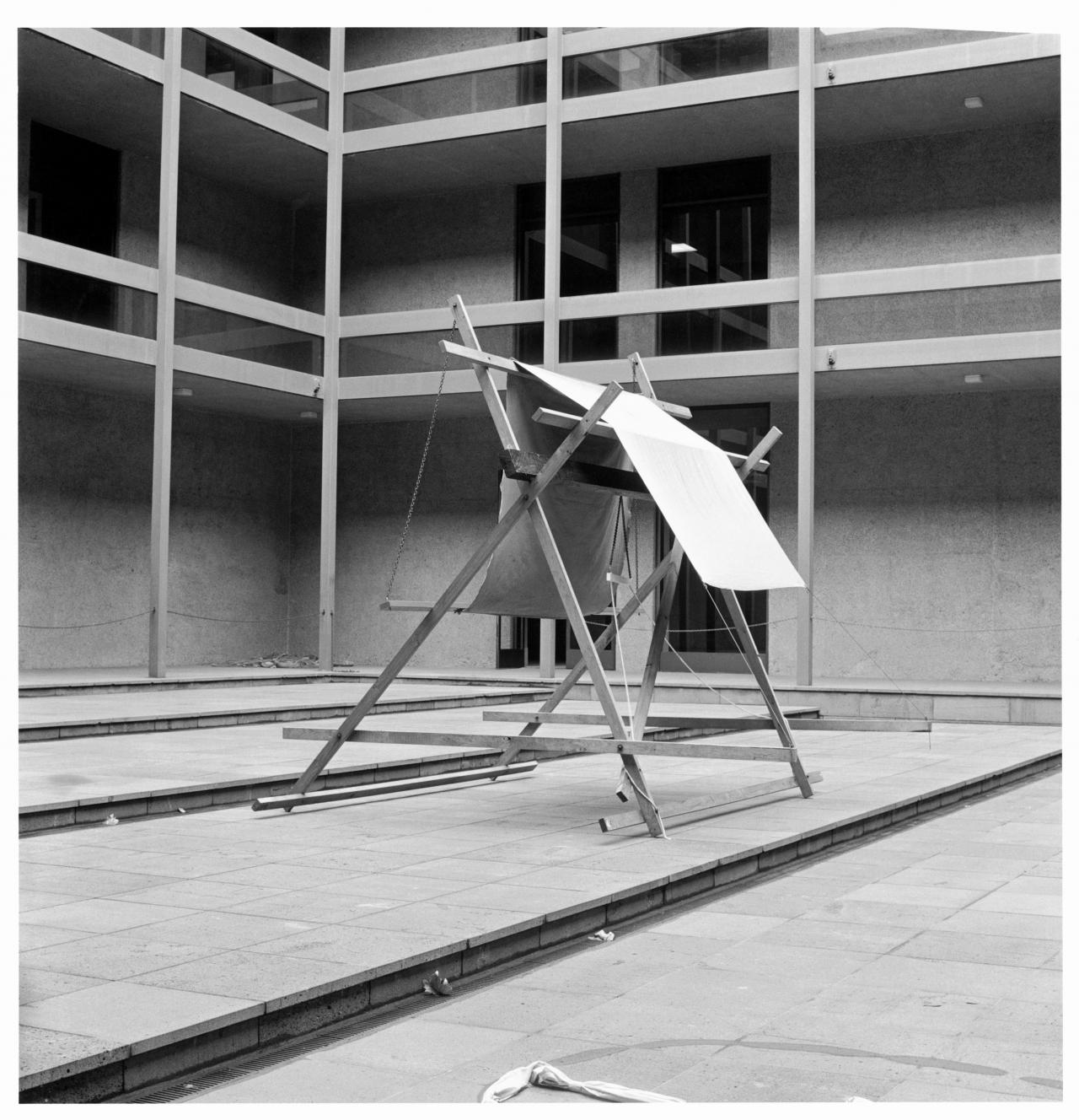 Subsequent documentary photography of the project largely focused on images of the exhibition at the NGV rather than the Bonython Gallery installation.22 Baume, p. 22; Forbat, pp. 77, 84–5. A small photograph of Szeemann installing work at the Bonython Gallery appears in Forbat, p. 78. In part, this may be attributed to the fact that the exhibition spaces of Roy Grounds’s new St Kilda Road gallery better lent themselves to the avant-garde and conceptual nature of the work, in contrast to the smaller spaces of Bonython Gallery. It could also be due to the authority an institutional setting had in endorsing the significance and value of many of the experimental works.