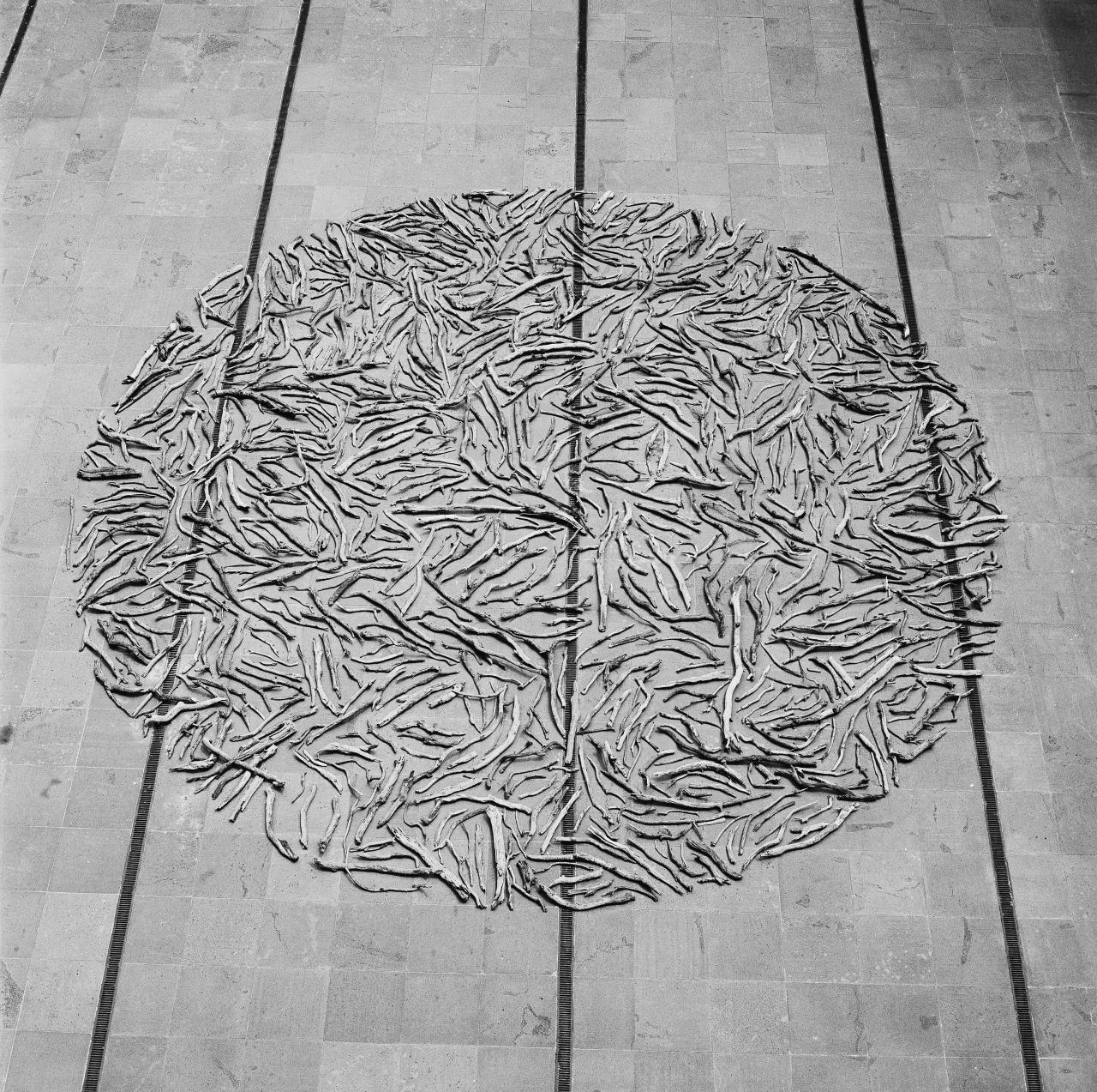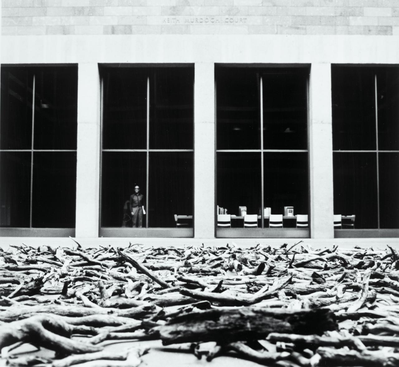 Richard Long’s Art Project was similarly framed. For the Art Project, he presented Bushwood circle, 8 December 1977 – 7 January 1978, NGV, Melbourne (figs 11 and 12); and Stone Line, 15 December 1977 – 5 February 1978, AGNSW, Sydney. In December 1977, he undertook one of his conceptually defined walks, this time through the Australian landscape somewhere near Broken Hill. The walk was made on a daily basis, with the artist returning to the same campsite each night: one of a series of straight 100-mile walks the artist had made in a number of countries. In an interview, Long said: