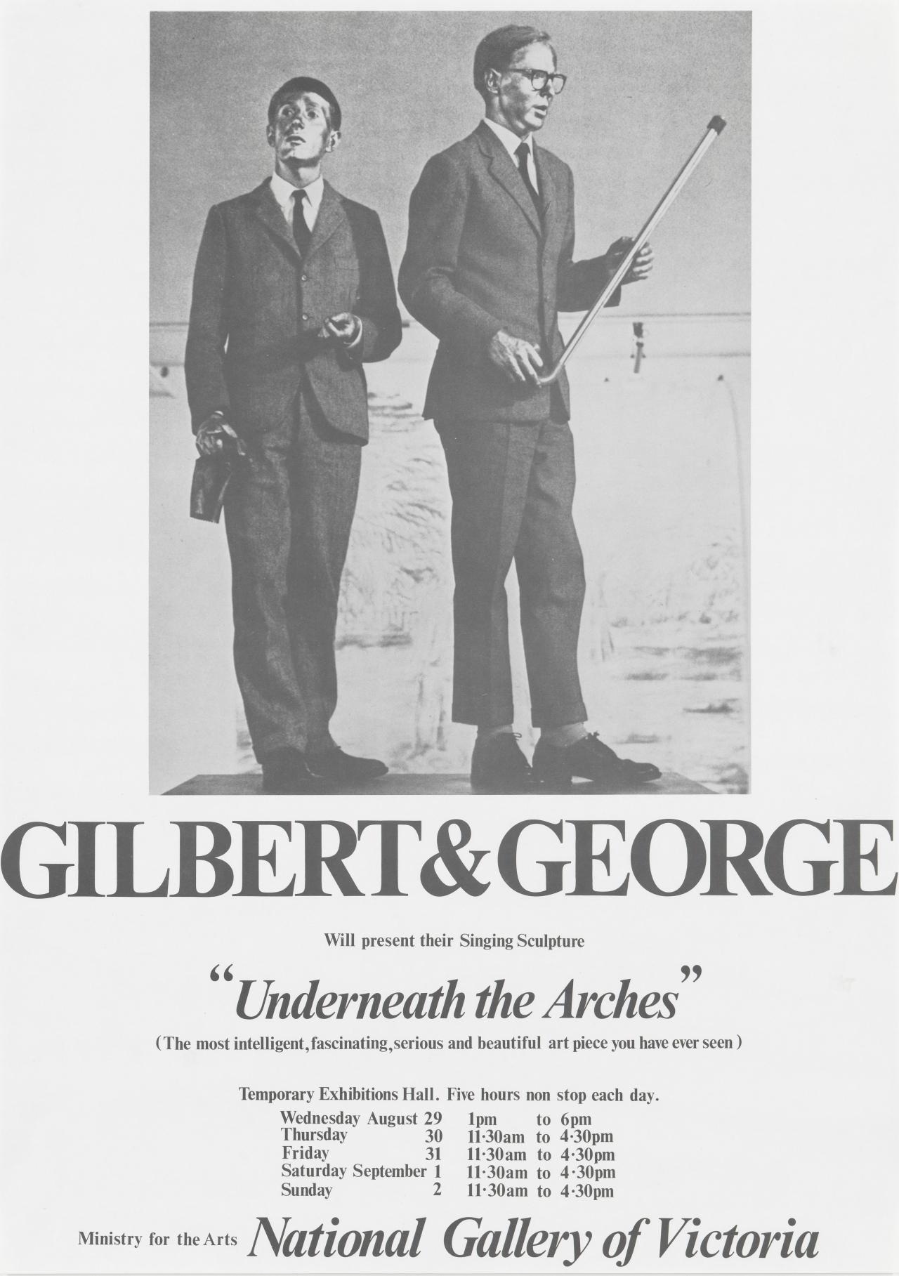 Atop a table, dressed in almost identical tailored suits and ties, their faces and hands covered in metallic paint, and holding a cane and one rubber glove, the two artists genteelly sang along to Flanagan and Allen’s 1930s music-hall tune ‘Underneath the arches’, which played on a portable tape recorder (fig. 1). Charles Green and others have written extensively on Gilbert & George’s presentation of The singing sculpture in Australia.36 For a discussion of Gilbert & George’s Australian presentations, see Charles Green, The Third Hand: Collaborations in Art From Conceptual- ism to Postmodern, University of Minnesota Press, Minneapolis, 2001; and Charles Green, ‘Doppelgangers and the third force: the artistic collaborations of Gilbert & George and Marina Abramović/Ulay’, Art Journal of the National Gallery of Victoria, National Gallery of Victoria, Melbourne, vol. 59, no. 2, 2000, pp. 36–42.