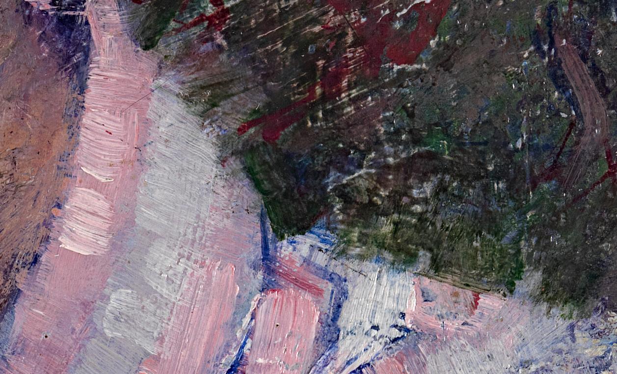 The reworked and heavily worked areas of the portrait contrast with other sections of the canvas where Russell has intentionally blurred the boundaries of his forms (fig. 5), such as along the borders of the sleeves. In working in this way, he is intent not on rendering forms in a realistic manner but on emphasising chromatic tensions, for example in his use of garance foncée (a deep, transparent red) juxtapositioned with emerald green.25The garance foncée outline along Dr Maloney’s sleeves indicates Russell’s need at times to define the shape before he can confidently break down its edges. In other areas, the breaking down of forms seems less deliberate. Despite Russell’s awareness of the need to ‘avoid that smudge’ (Russell letter, 26 December 1887), the areas around the collar and the sitter’s left shoulder have been painted and then wiped out with turpentine and repainted. This has meant a lack of definition that appears to be the result of process not intention. This technique of blurring boundaries was developed from Russell’s training at the Slade, where it was employed as a device to break the surface, adding tension to the painted forms while relying on the play of light on colour to provide dimensionality. From 1887 Russell used both broken colour and chromatic juxtapositioning, rather than brushwork alone, to create these kinds of visual effects, and to move the viewer from a realistic to a more aesthetically complex reading of his work.