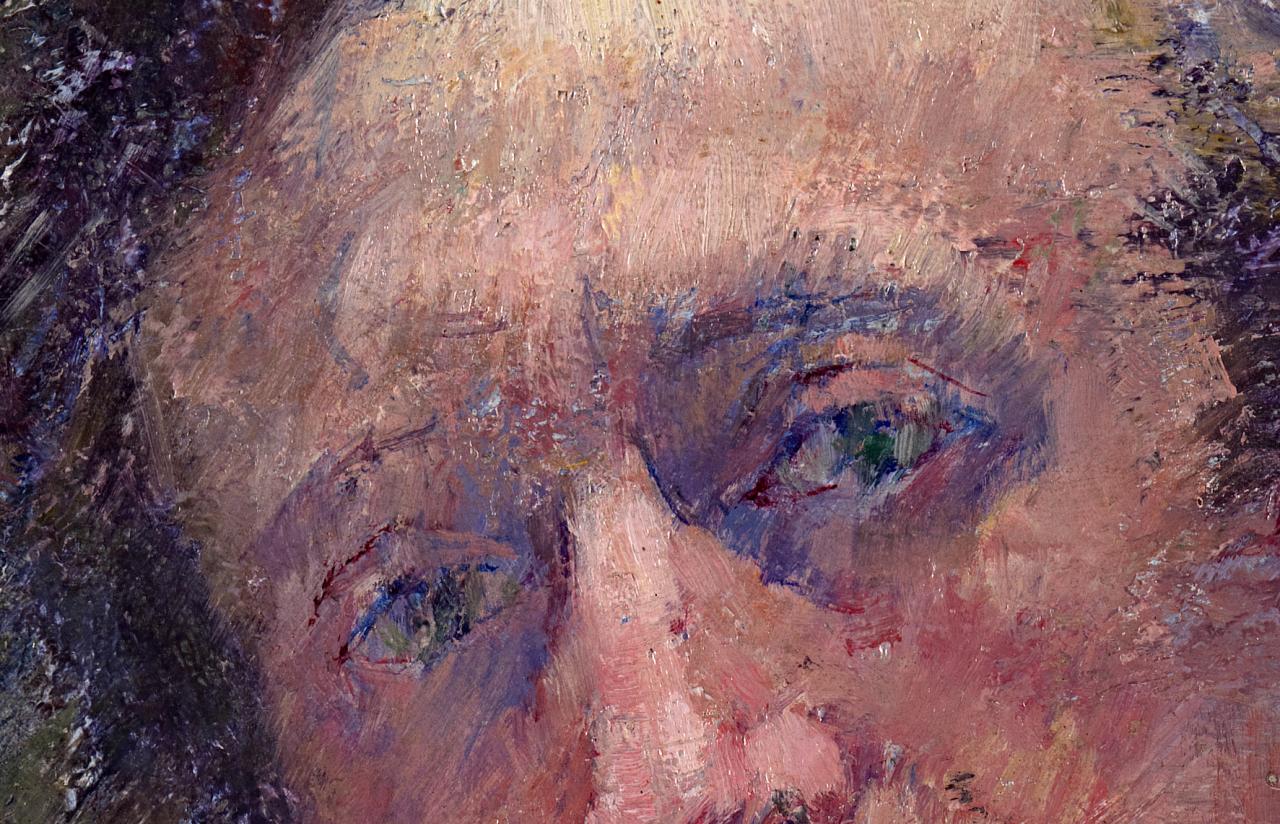 Russell has added a new drama to his own earlier formats by turning his sitter’s head to give a three-quarter view in which the subject looks out across his shoulder at the viewer. The traditional académie palette of browns, reds and fleshtones is used, against a brown background. But the lighting has become a much stronger aesthetic element, falling across the planes of the subject’s face and across the hand holding the pencil, while completely missing the shoulder. This kind of illumination, combined with the deliberate effect of rapid brushwork as in an ébauche, suggests that the portrait is to be seen as a study in creative intensity – on the part of artist as well as sitter.