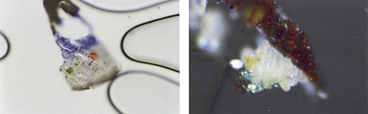 Another factor contributing to the darkening of Russell’s pictures was his use of pigments with little additional oil to lock them up,29See note 24 above. and the lack of varnish on his paintings could also exacerbate darkening. Some of the pigments he used were also extremely susceptible to chemical alterations, and needed to be applied carefully.30For example, the bright blue-green pigment paolo veronese, which is comprised of emerald green and viridian, was found in all three samples. This pigment consists of copper acetoarsenite, and is blackened by sulphurous air and sulphur-bearing pigments. In the Melbourne portrait, there are three sulphur-bearing pigments which, if not well prepared, could contain free sulphur. They are: vermilion (mercuric sulphide), French ultramarine (a compound of sodium, silicon, aluminium, sulphur and oxygen) and cadmium yellow (cadmium sulphide).