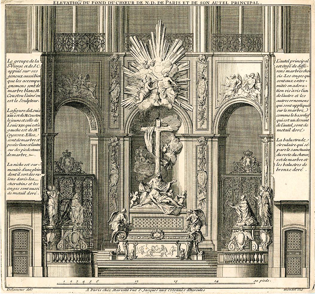 Earlier commentators sought the model for Willems’s Pietà in an engraving after Van Dyck or Rubens.37For example, Lane, p. 73; Patrick Synge-Hutchinson, ‘A unique essay in English ceramic art’, The Connoisseur, vol. 156, June 1964, pp. 86–7. It certainly appears to be the case that Willems drew upon engravings after seventeenth-century Flemish artists for inspiration for some of his models, an unsurprising set of circumstances for a Flemish modeller.38See Arthur Lane, ‘Chelsea porcelain figures and the modeller Joseph Willems’, The Connoisseur, vol. 145, May 1960, pp. 245–51. Willems’s immediate model for his Pietà group, however, would appear to lie not in a painting but in the marble sculpture of the Pietà by Coustou in the choir of Notre Dame de Paris (fig. 7).39François Souchal, French Sculptors of the 17th and 18th Centuries: The Reign of Louis XIV: Illustrated Catalogue, vol. 1 A–F, Cassirer, Oxford, 1977, pp. 170–1. This sculpture, part of a larger installation memorialising Louis XIII and Louis XIV, was begun in 1699 to designs by the architect Jules Hardouin-Mansart and was completed nearly fifteen years later under the direction of Robert de Cotte. The elaborate ensemble consisted of many statues, reliefs and decorative elements. Only parts of the monument remain in Notre Dame today, much of the material being removed during the French Revolution and partially restored in the nineteenth century. Coustou’s Pietà was set in a niche behind the high altar, flanked on either side by the kneeling figure of Louis XIII offering up his crown to the Virgin, and Louis XIV kneeling before her, giving thanks for his life.