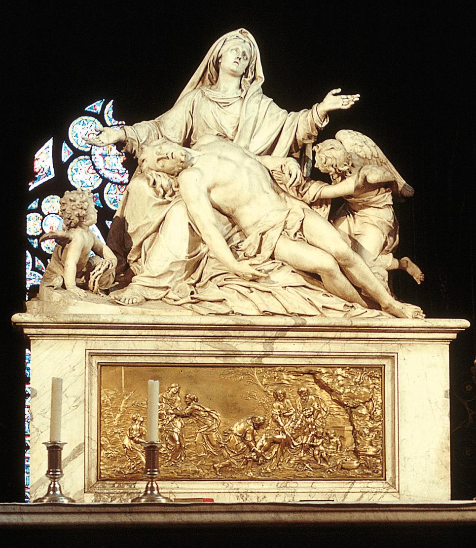 Willems’s modifications to Coustou’s composition have radical results. Coustou’s Pietà is characterised by a strong frontal orientation. The Virgin, with her outstretched arms, directly faces the viewer before the altar. The body of Christ lies across her lap horizontally, echoing the orientation of her arms. The angel who leans in to adore the wounded hand of Christ is also oriented parallel to the body of Christ, presenting his left side to the viewer. The putto grasping the fallen crown of thorns on the proper right of the Virgin gazes upward and across at the head of the dead Christ, emphasising the strong right-to-left horizontal plane of the composition.
