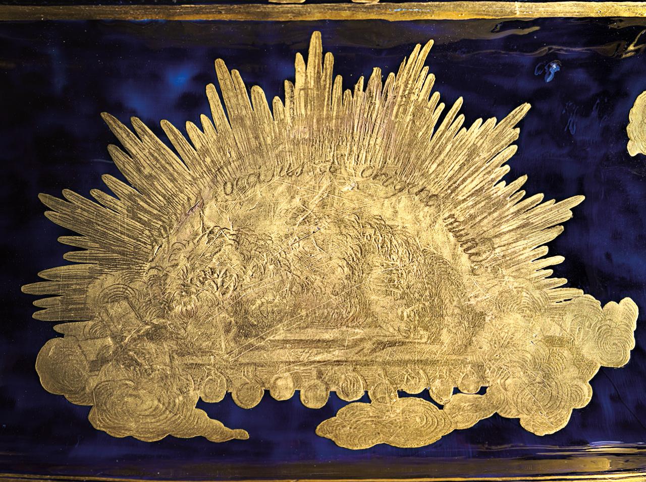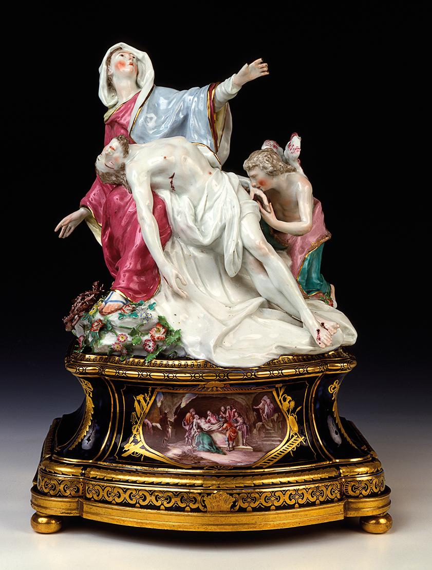A second example of the Gold Anchor version was sold on the London market in 1991 and is now in a private collection.35Christie’s, London, 11 February 1991, lot 90. This example is finished with polychrome enamels, but includes a porcelain plinth decorated in a mazarine blue ground upon which the figure group sits. This plinth is decorated with tooled gilt ornament depicting the Arma Christi and a central polychrome vignette of the deposition (fig. 6).