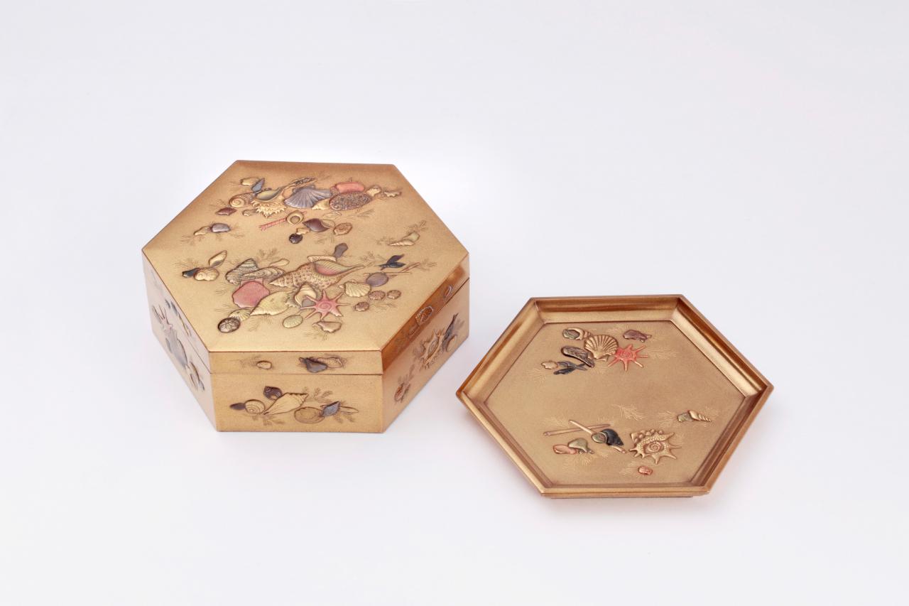 Incense and the tools used to prepare and present the fragrance, like the shells with their kai-oke, have given rise to objects of exquisite beauty, as seen in the incense games in the Golden Shells and the Gentle Mastery of Japanese Lacquer exhibition. The origins of the incense competition (kō-awase 香合わせ) are in the aristocratic Heian era (794–1185 CE). Perhaps the most well-known example of an incense competition occurs in The Tale of Genji. In the chapter ‘A branch of plum’ (Umegae), Genji, the ‘Shining Prince’, has created blends that everyone agrees are superior. This scene depicts a time when courtiers blended their own scents according to personal and secret recipes. As it exists today, the ‘incense ceremony’ may still be conducted as a competition, but the focus is different. Codified into the highly ritualised Way of Incense (kōdō 香道), the required tools are aesthetic objects in themselves. Nowadays, the goal is for participants to show they can discriminate between several varieties of aloeswood ( jinkō 沈香) and subsequently to recognise those same scents when they are burned again. It is really a competition of sensitive noses.