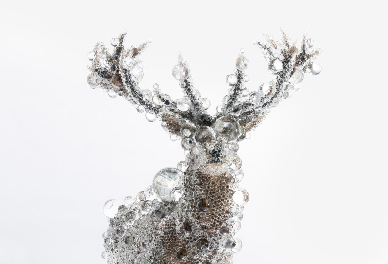 In the same way that Nawa discovers his subjects in the format of a matrix of digital pixels on the computer screen, his artistic process encapsulates the animal in an actual three-dimensional matrix of cells, in the form of glass beads. The large and small glass spheres covering the animal produce an effect of viewing it through many small optical prisms. This creates a visual experience with a new depth and continuity in which multiple details can be seen simultaneously and the viewer is encouraged to observe the inner object from an entirely new perspective. PixCell-Red Deer reminds us that both the real world and the fabricated world of the internet are ambiguous and uncertain places where human senses attempt to perceive the truth.