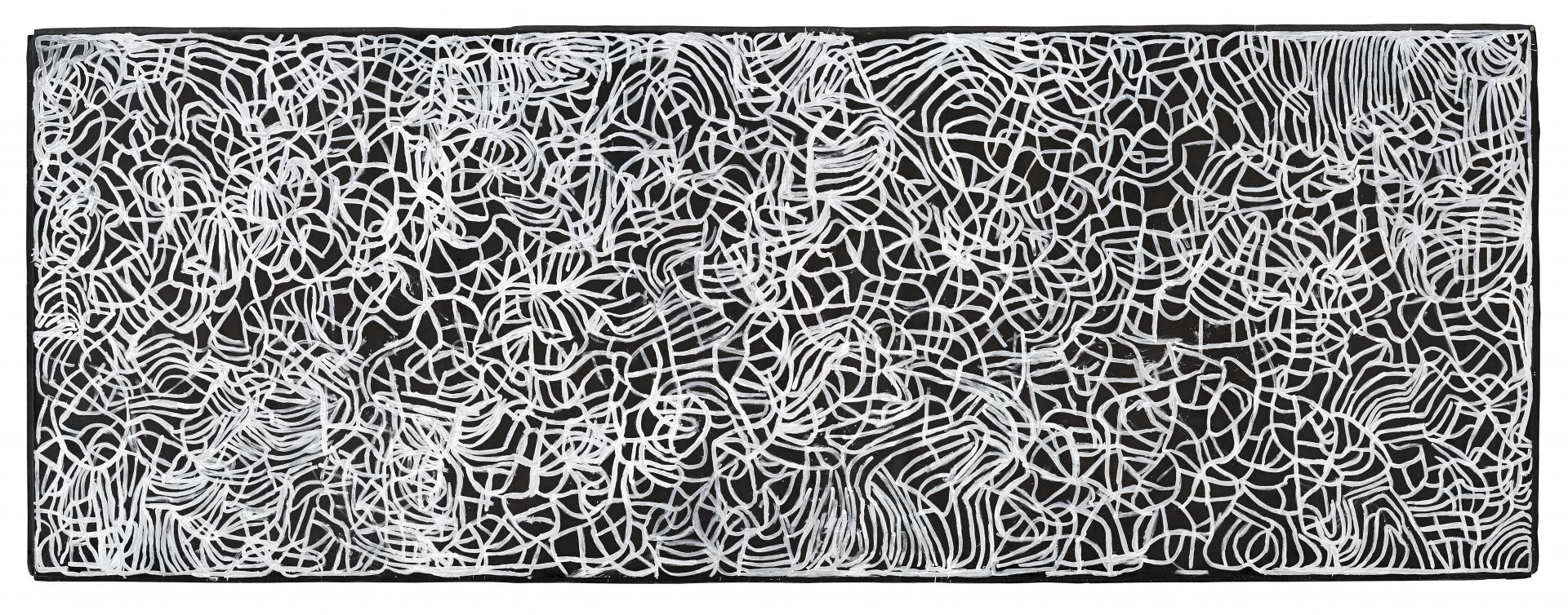 Kwementyay Kngwarreye’s Big yam Dreaming demands to be considered among the great contemporary masterpieces of our time. This central icon of the Gallery’s collection, measuring three by nine metres, is painted entirely in bold white lines on black. It celebrates the natural increase of anooralya (the finger yam) at Alhalkere, country sacred to the artist. When the yam is in full growth, a green leaf spreads over the country. As the vegetable tuber ripens and is ready to eat, the leaf declines and cracks appear in the ground, revealing the nature of the long-tubered plant and its pattern of growth. The white linear network in Big yam Dreaming signifies these cracks in the ground and the long-branching tuberous plant underground, which has the taste and colour of a potato and is eaten raw or cooked.