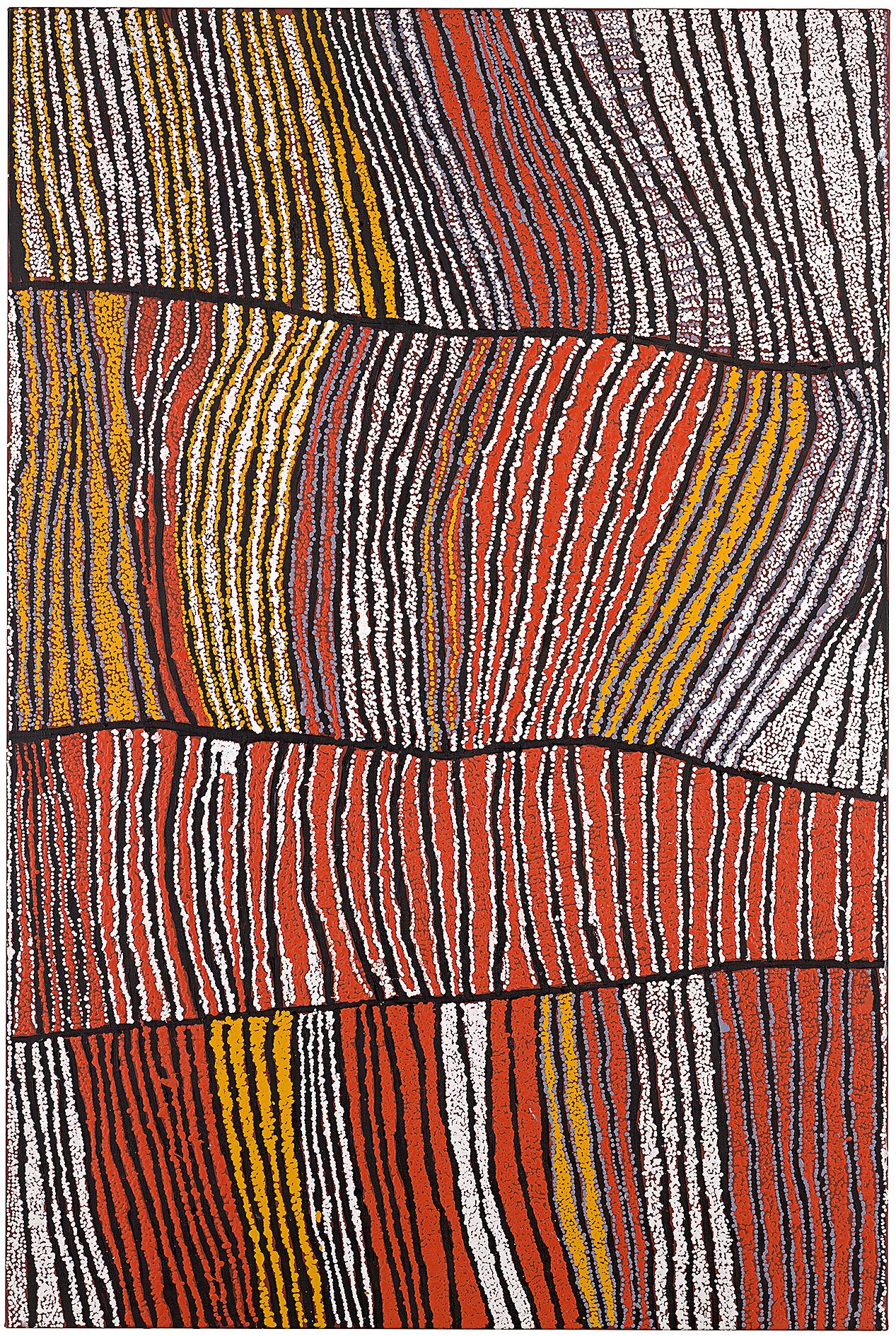 The dramatic cross motif, enlivened by an echo of multiple parallel lines in alternating colours divides the surface of the picture in much the same way that the rock hole determines the layout of the ceremonial ground it depicts. Highly decorated ceremonial objects, perhaps belonging to Yina himself or to ancestors that followed, lie scattered nearby, heightening graphically the ritual potency and ultimately the mystery of the surrounds. A constellation of roundels hang like satellites in a sea of dotted stars, positioning seated men, sand drawings and rocky outcrops that erupt from the desert floor.
