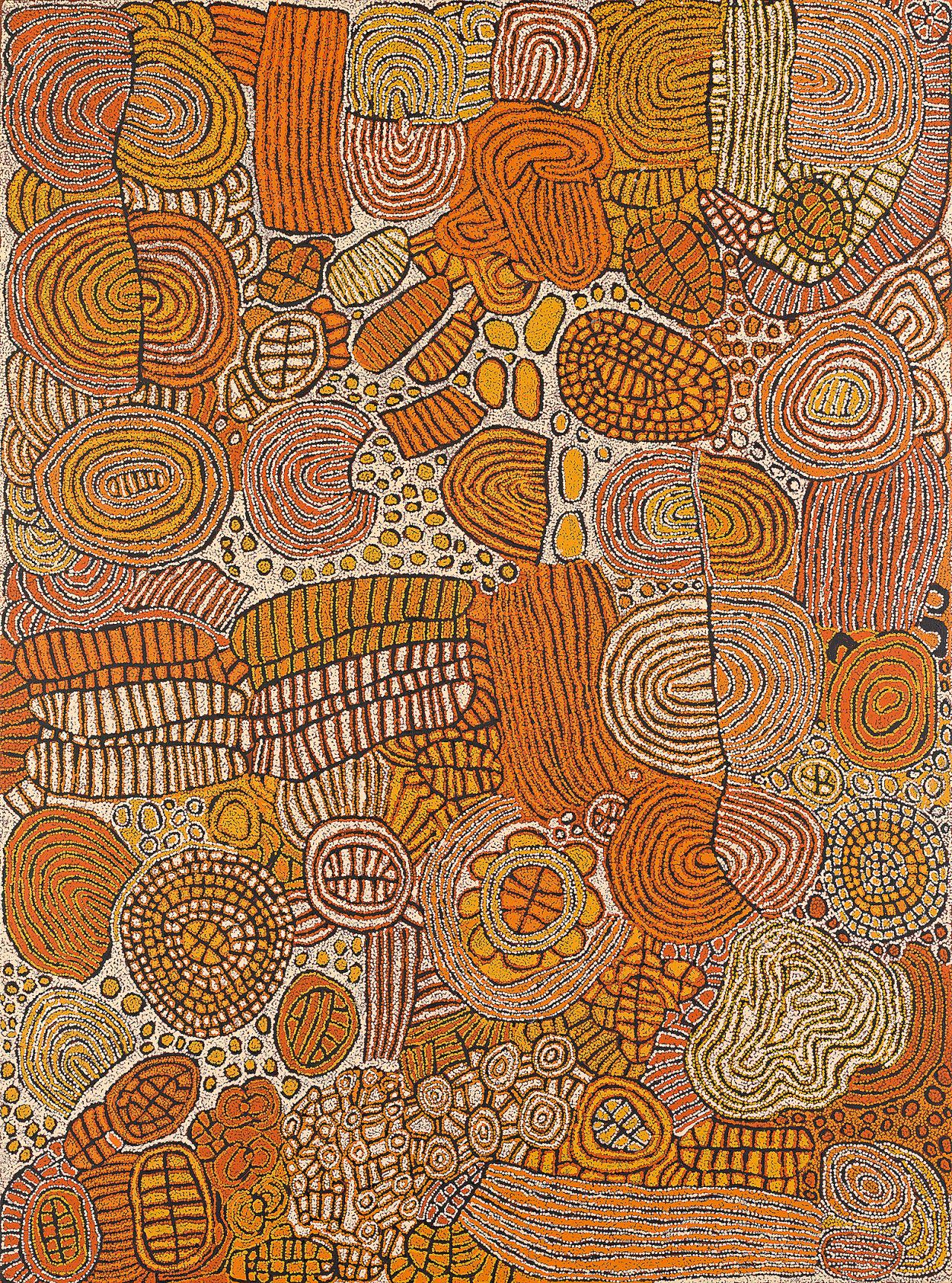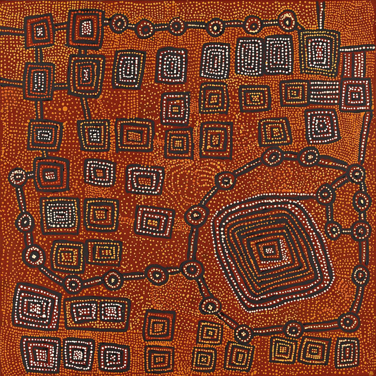 With its entry into the collection of the NGV, as a gift of the Felton Bequest, Women’s Dreaming at Tjukurla joins a selection of works that chronicles one of the great artistic lineages of the Western Desert. The artistic practice of this family, almost more than any other, maps the history and trajectory of the Aboriginal-owned and managed Papunya Tula Artists. The NGV’s holdings of this amazing family of artists articulates an evolution from its precarious beginnings on discarded scraps of timber left among the squalor of the government settlement of Papunya to its current masterworks on Belgian linen, created in a purpose-built studio in the Pintupi homeland of Walungurru.