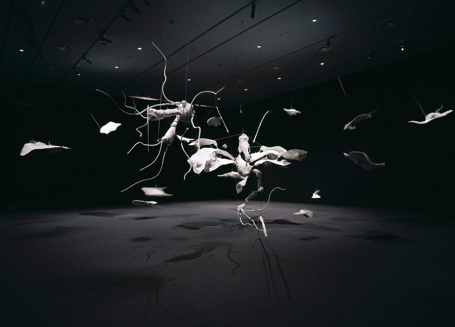 Untitled was produced for the exhibition world rush_4 artists, the inaugural special exhibition to celebrate the reopening of the National Gallery of Victoria on St Kilda Road. This work elaborates her transition from cyborgs to works like Amaryllis and Siren, in which strangely beautiful and equally unsettling hybrid beings were the fusion of the mechanical, with organic forms inspired by insect bodies and botany. In Untitled Lee turns her attention away from the specifically feminine body to the diverse composition of the world at large, to the systems of knowledge that structure our understanding of the body and the spaces it inhabits. In doing so, Lee’s work demands a space for continued wonder in a contemporary world of overdetermination, dominated by an increasingly accelerated pace of biotechnological research, the extinction of species and political and cultural instability.