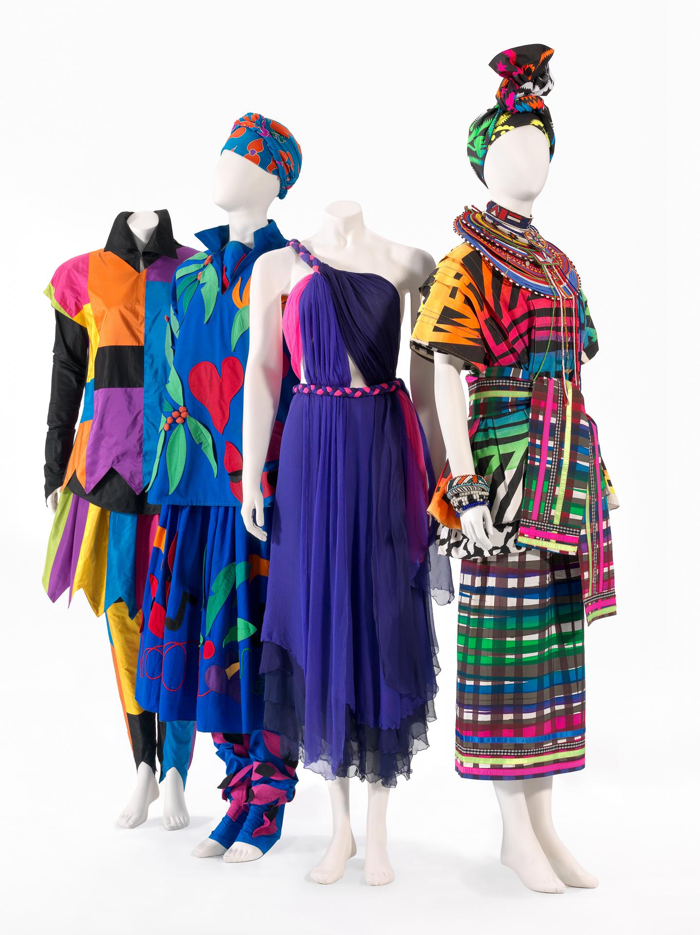 In 1982 Jackson parted ways with Kee and Flamingo Park, establishing her own design studio, Bush Couture. Maasai Africa, 1984–88, is from this key period, when Jackson continued to develop and adapt some of her already unorthodox methods, incorporating freehand stencilling, fluorescent pigments and bold designs without repeats. With its simple layered silhouette and vibrant rainbow and zebra prints inspired by the traditional textiles and beaded jewellery of Africa, this outfit is a consummate example of Jackson’s adventurous approach to styling and design.