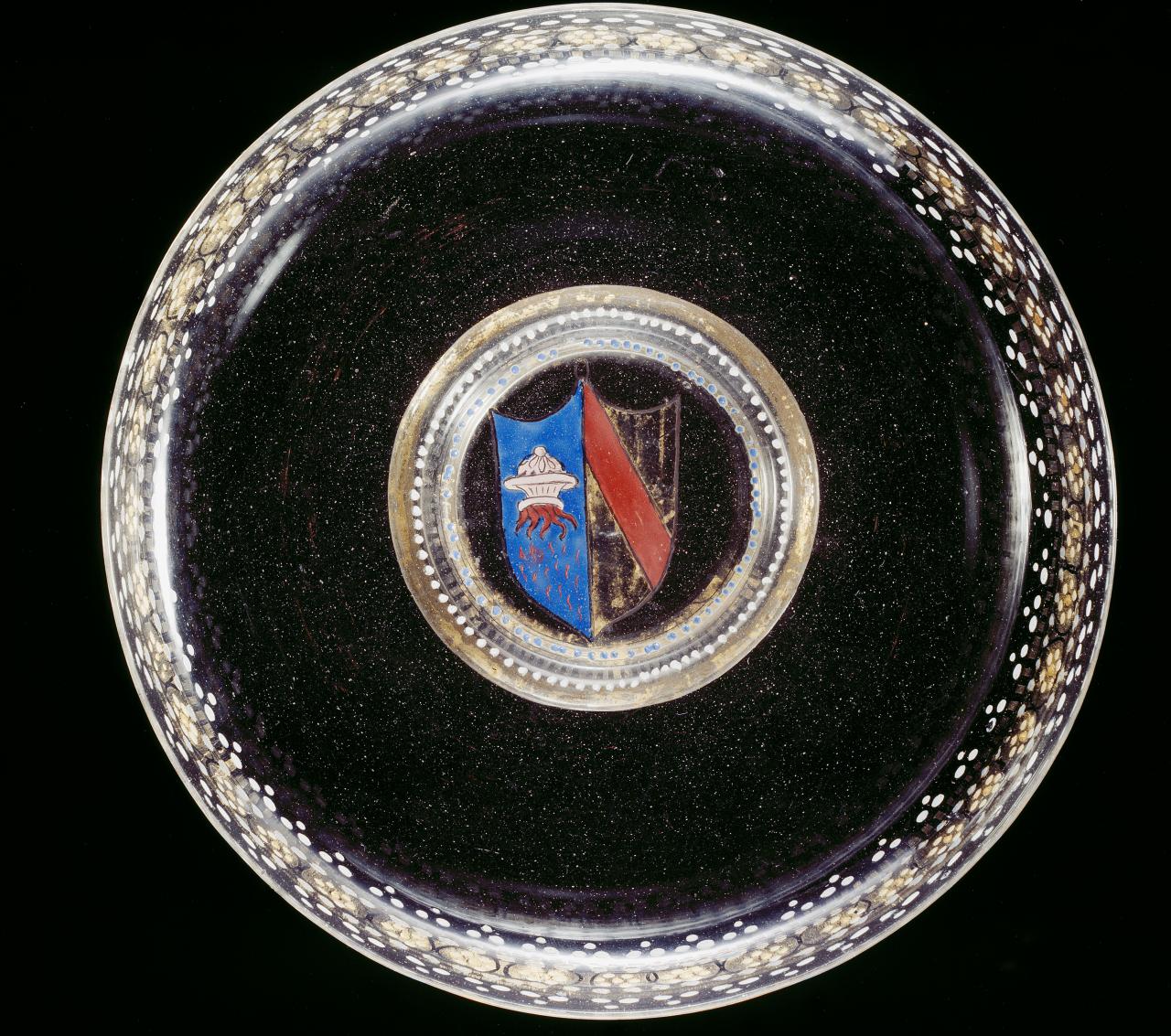 A footed dish with enamelled decoration dating to the early sixteenth century exemplifies the luminous clarity achieved by the Murano glass masters. The armorial decoration executed in coloured enamels is an indication of the elite context in which this work was originally conceived. The new Venetian glass was a desirable luxury commodity and it was collected voraciously by ruling elites in Renaissance Europe. Patrons and artists began to produce sophisticated designs for glass forms and decoration, which were sent to Venice for production by the Muranese masters. The fashionable grotesque style (fantastical decorations of animals and humans morphing into plant motifs) of the late-fifteenth century derived from the newly discovered Roman wall paintings excavated in the Domus Aurea, Nero’s palace, inspired Venetian glassmakers to push the possibilities of their very pliable material to produce ever more complex and sculptural grotesque glass objects.