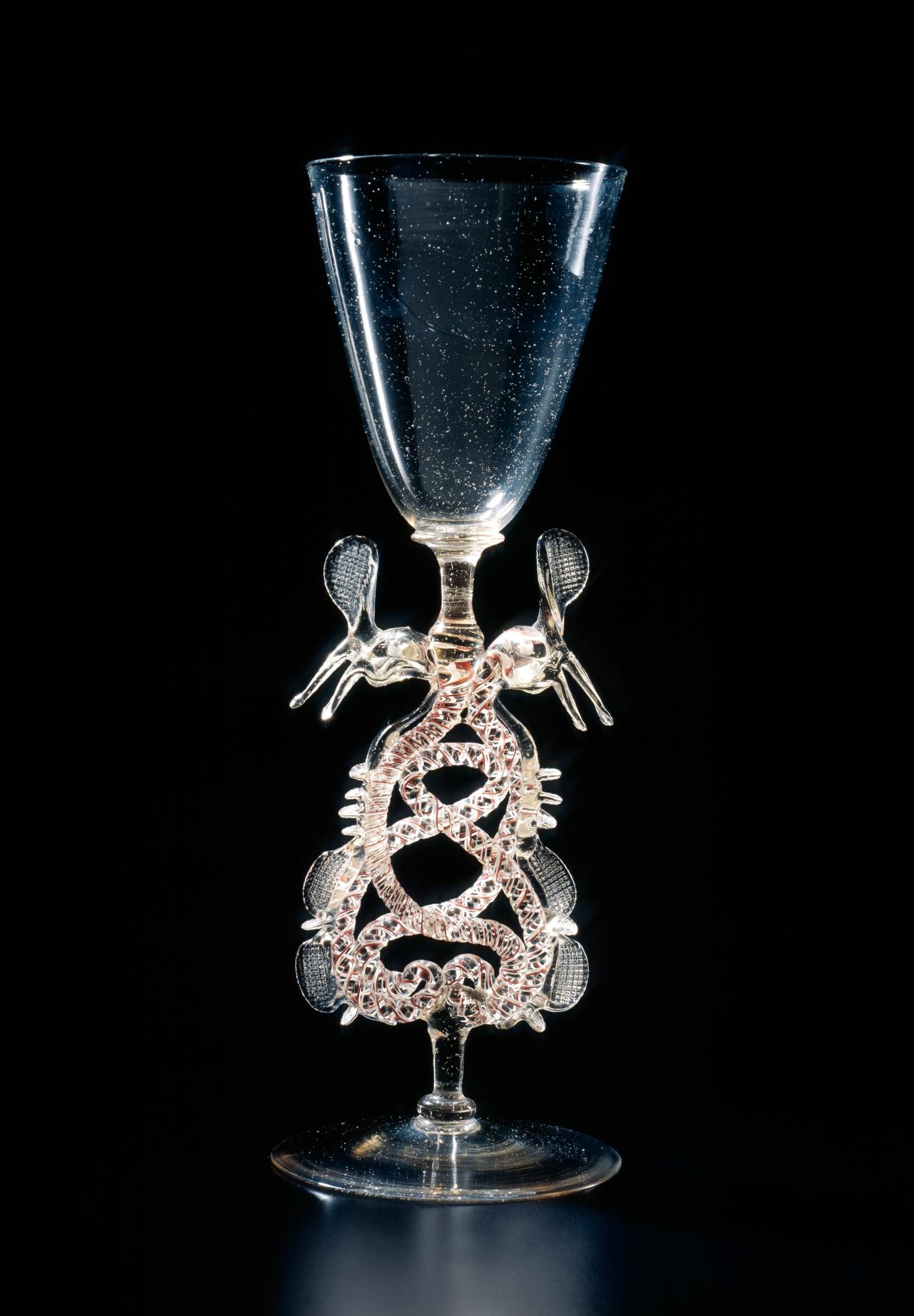 A German or Dutch façon de Venise goblet of the early seventeenth century with its double serpent stem embodies the flamboyant grotesque decoration fashionable throughout Europe.