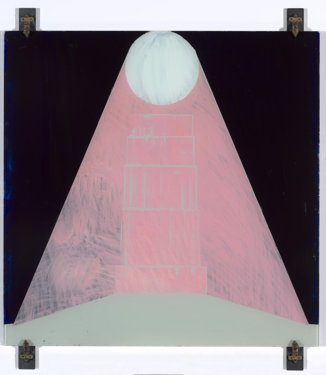 In his 1435 treatise De pictura, Alberti famously instructed artists to ‘regard’ the frame of the painting as an open window. Considerable debate about what Alberti meant by this has ensued. Was the emphasis on a picture striving for mimesis with what one sees through the glass, or was Alberti referring to the immobility of vision, framed and ordered, as it pertains to perspective? Milledge’s paintings do not consciously engage with this history, but they do, through form and content, use the window as a metaphor, albeit negated. Milledge’s use of glass as a surface playfully denies its defining quality: transparency. This negation severs contact with the notion of the open window and seems to push us towards observing something liminal, half here and always elsewhere. We look through the glass but instead of seeing an ordered landscape or a mimetically accurate scene or even the museum wall, we see simplification, botanical abstraction, symbolic ambiguity and maybe our own reflection. These paintings do not strive to ‘make sense’; they are manifestations of an associative process that include poetry, painting, and myth. There is an echo in Milledge’s paintings of phosphenes (the experience of seeing light when your eyes are closed), or what is sometimes referred to as ‘prisoner’s cinema’ (images and hallucinations which arise as either torment or solace for those kept in isolation or darkness).