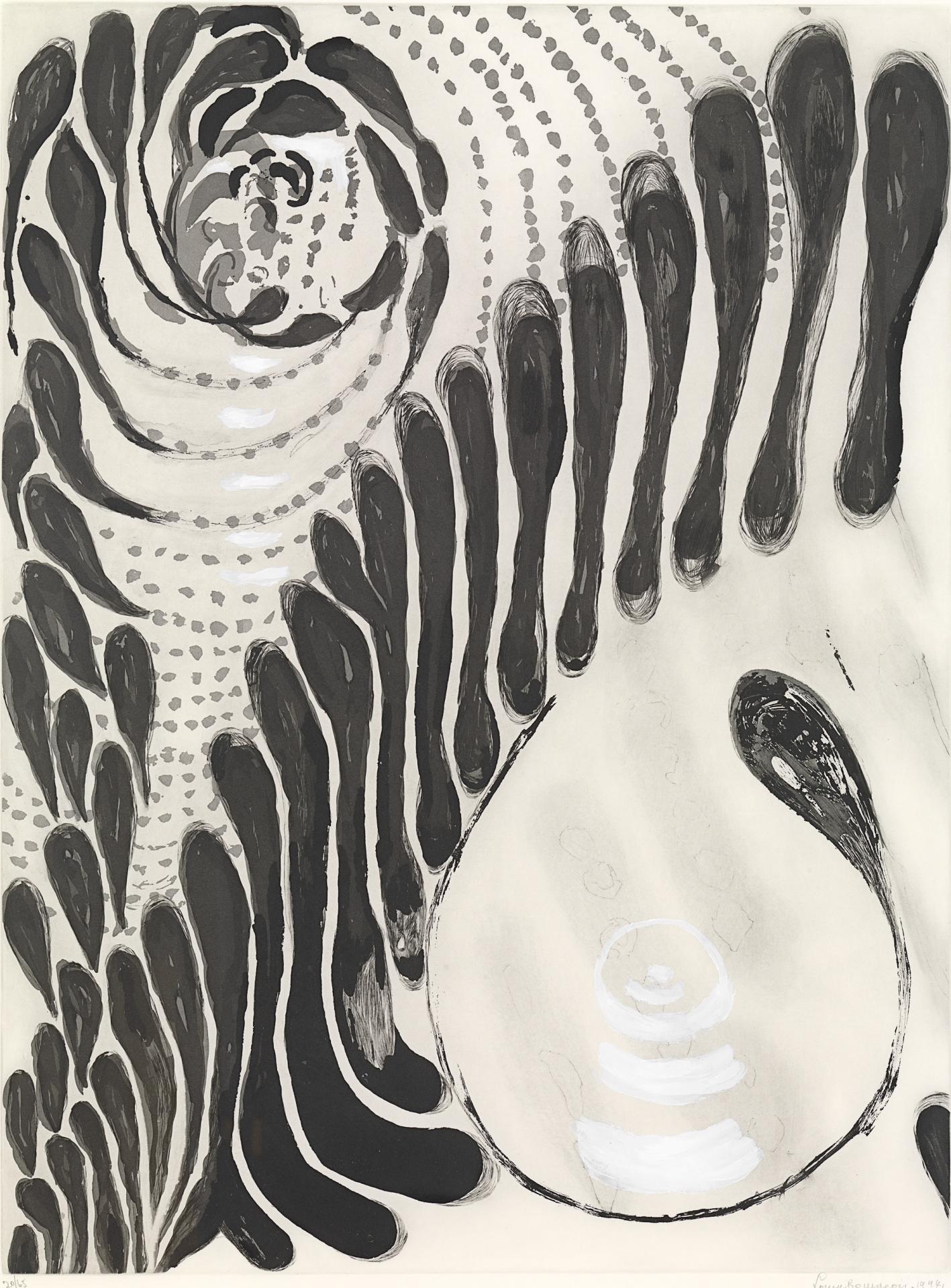 In August 2009 the NGV launched a new supporters group for the Prints and Drawings collection and, to mark the occasion, two longstanding patrons, Eric Harding and Athol Hawke, donated Paris Review by Louise Bourgeois. This print by the French-born sculptor, painter and printmaker was based on a drawing that Bourgeois created just prior to her representation at the Venice Biennale in 1993. Named after Paris Review, an arts journal established in 1953, the artist has inverted and reproduced the original drawing on a larger scale in lift-ground aquatint and drypoint. Compulsive and prolific in her daily drawing practice, many of Bourgeois’s abstract works use the motifs of circles, lines and points. This work is unique in that the artist has added white gouache to emphasise the energy and concentric movement of the printed forms.