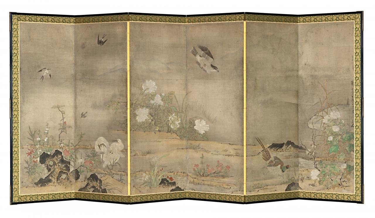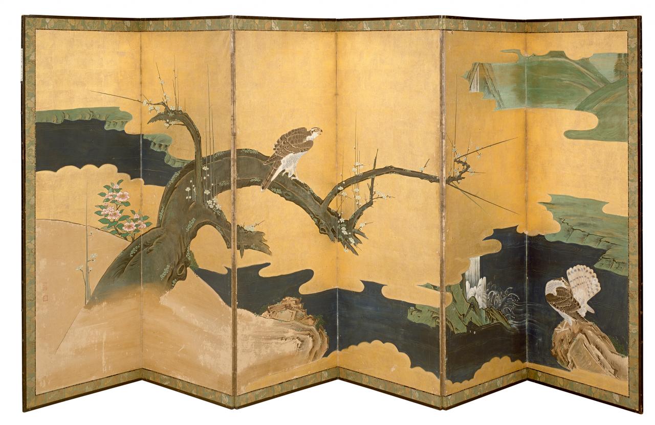 Tamura Chokuo’s paintings, Hawks in a landscape, a pair of six-fold screens (fig.