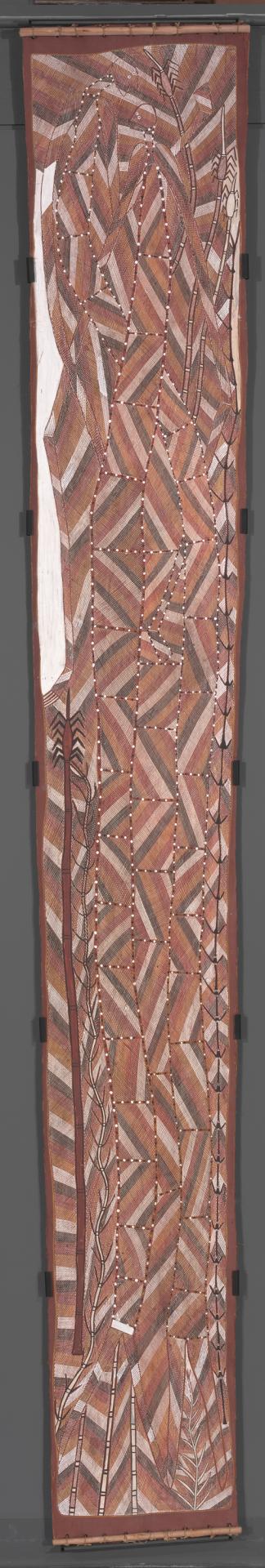 James Iyuna’s Yawkyawk spirits at Barrihdjowkkeng, 1990, is an elongated painting of two narrow twisting Yawkyawk at a waterhole, entangled with water weed and waterlilies. Iyuna has drawn Yawkyawk with white dotted red-ochre lines over a rectangular ground of delicate rarrk on a red ochre surface. Water plants and waterlilies are drawn in sepia, mirroring the shape and rhythm of the spirits’ forms. A shaft of brilliant delek in the upper left indicates the presence of Ngalyod at this waterhole alluding to the Yawkyawk’s transformation.
