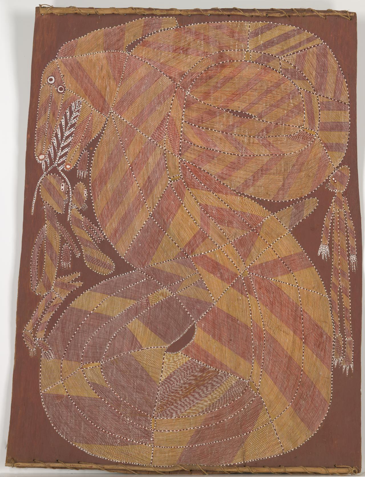 Marralwanga’s Rainbow Serpent of the Dreaming, 1975, represents Ngalyod as a twisting, thrusting serpent with ears of a macropod whose body is embellished with scales formed of rarrk designs that gyrate at different angles. The trees that sprout from her body and the tract of land emerging from her tail reveal Ngalyod’s immense power as creator of land and waterways and also as an animating force eternally present in the land. David Milaybuma also shows her as a transforming creature with the head and ears of a kangaroo and serpent’s body, a mother creator who encircles her eggs.