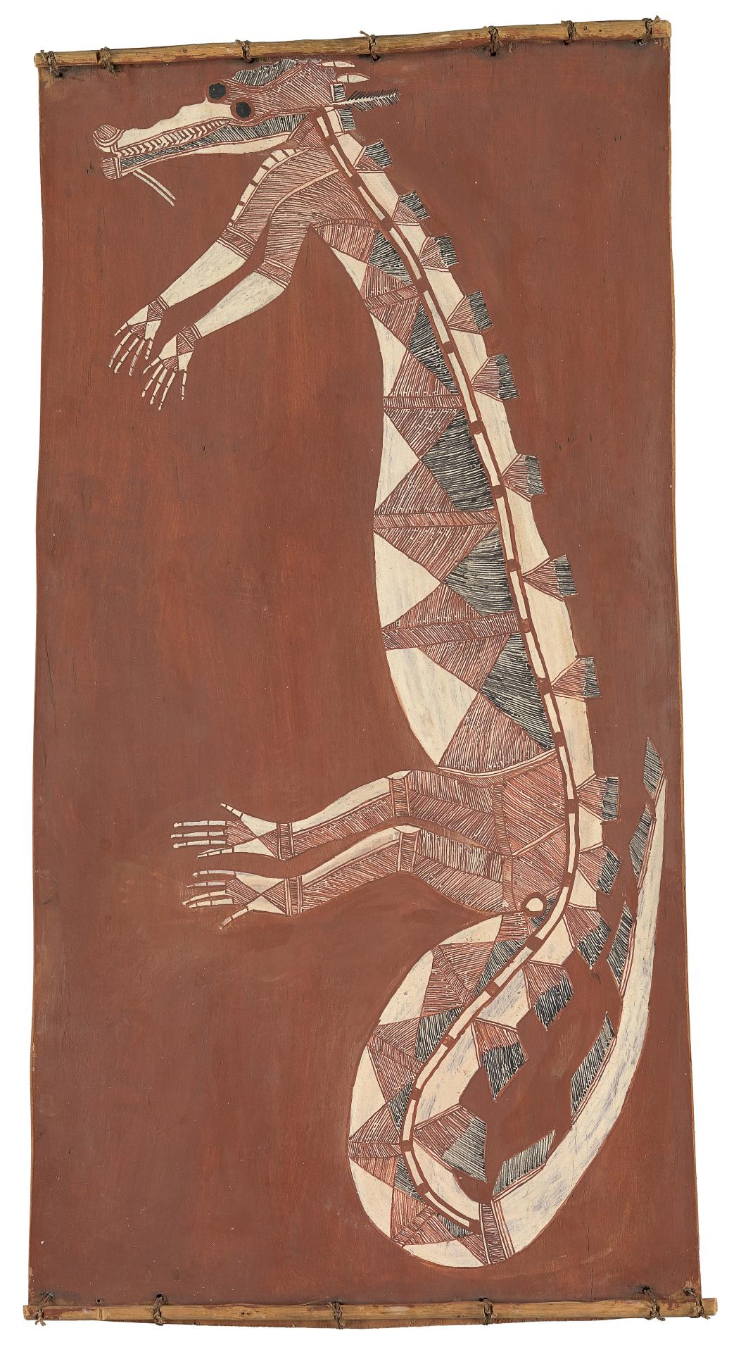 In marked contrast to these Kuninjku artists, who live on outstations in the Maningrida hinterland and marketed their art via the community art centre Maningrida Arts & Culture, artist Bardayal Nadjamerrek was a Kundedjnjenghmi-speaking artist whose Mok clan lands were located on the Arnhem Land escarpment, the Kuwadehwadeh.14Lofty Bardayal Nadjamerrek AO, ‘Barridjangonhmi bim! Paint it for me’ in Hetti Perkins (ed.), Crossing Country: The Alchemy of Western Arnhem Land Art, Art Gallery of New South Wales, Sydney, NSW, pp. 96‒106. He marketed his work through Injalak Arts and lived in various outstations of Gunbalanya (Oenpelli) before finally returning to Kabulwarnamyo the sacred site of mankung djang (wild honey). Bardayal was taught to paint on rock by his father Yanjorluk and painted on bark in the X-ray style from about 1960. His Ngalyod, 1981 (below), reveals his singular rarrk style distinguished by single hatching in red and black on white that form triangular and diamond patterns. The body of Ngalyod stands stark on a red ochre ground, echoing Kunwinjku images on rock. She has the long snout, scaled backbone and tail of a crocodile, whiskers of a fish and ears, legs and body of a kangaroo.
