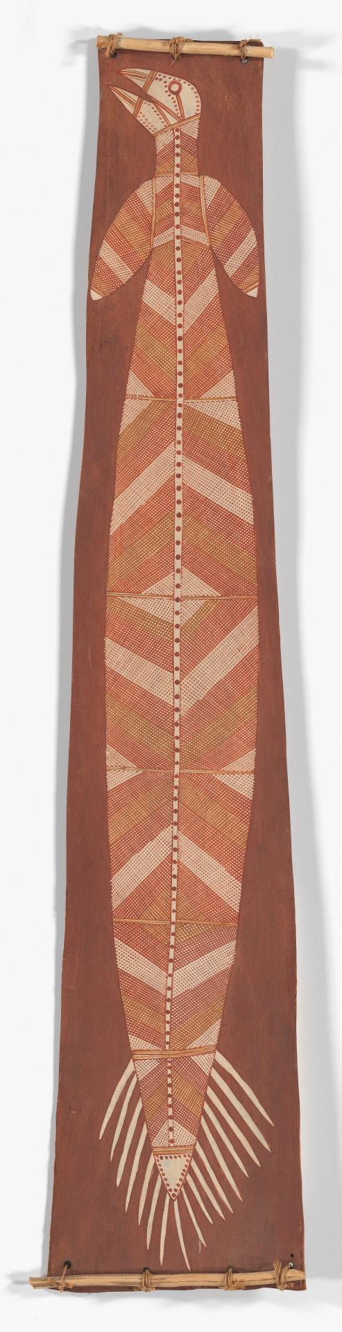 Artists conceive of Ngalyod as an extraordinary composite creature, a serpent whose scales are indicated with complex crosshatched patterns and whose body often swells to encompass most of the bark surface. Moreover, symbolic of her transformative power, Ngalyod’s body changes shape to incorporate one or more of the following features: jaw of crocodile, body of kangaroo, chest bulge of emu and horns of buffalo.
