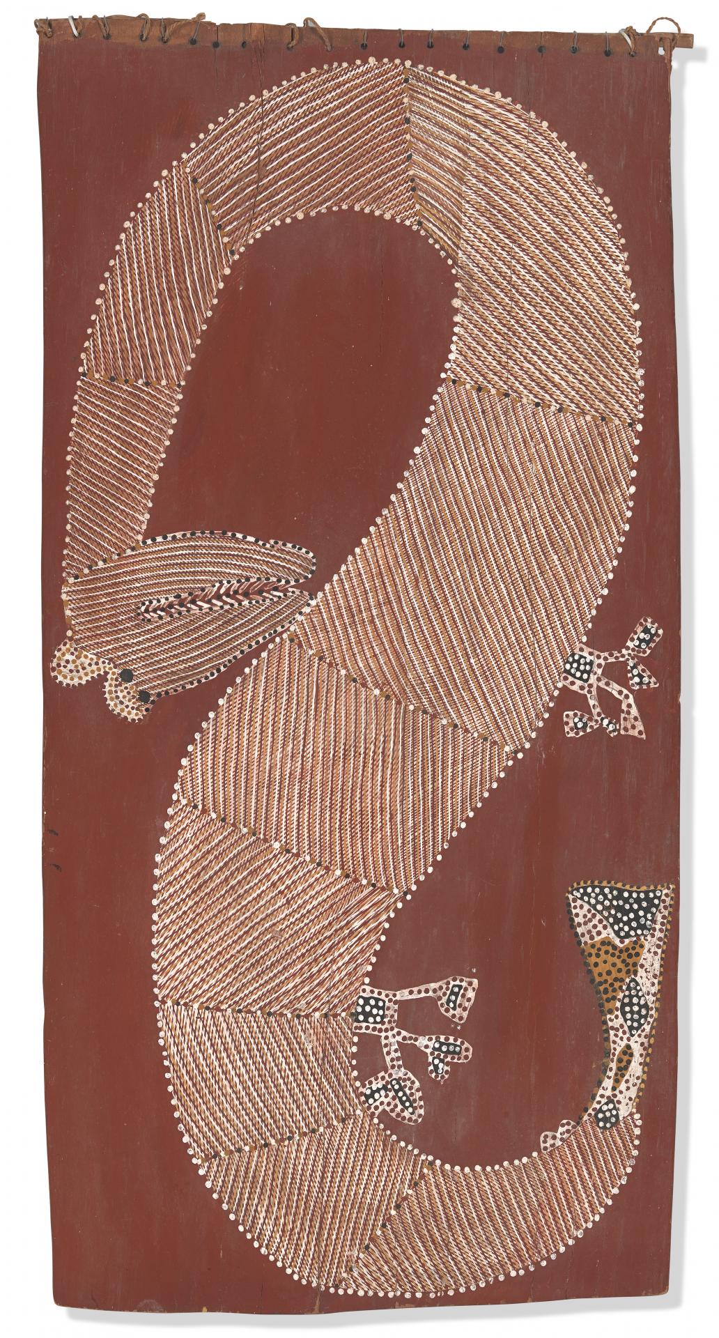 This is an assured example of the artist’s maturing style that reflects his lineage, honouring the rarrk style of his father and mentor, Kubarkku, but also introduces quirky and unexpected figurative drawings of Ngalyod and Yawkyawk before and after the young girl is transformed into a mermaid, which encircle and enliven the lorrkon with a story of transformation and presence in freshwater places of his Kulmaru clan.