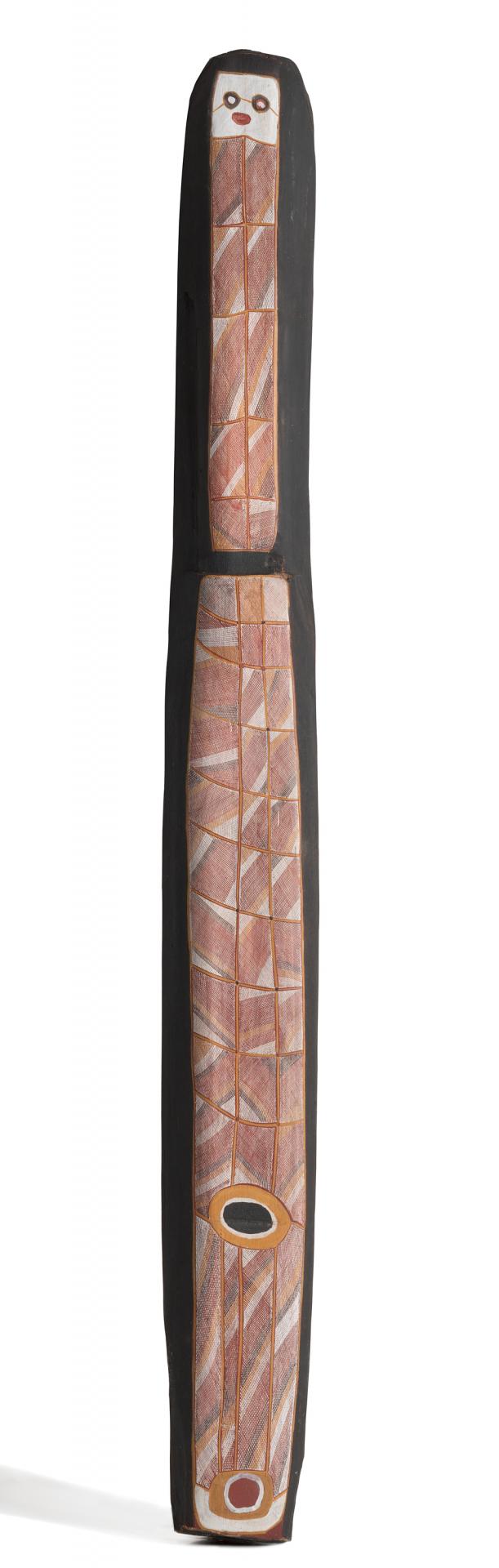 Dick Nadjolorro was the son of the significant artist and ceremonial leader Mick Kubarkku who instructed him in ritual matters and taught him how to paint. He and his brother Paul Nabulumo look after Kubumi, the djang of the Duwa moiety Yawkyawk. Interestingly, the artist narrated the creation story of Yawkyawk around the surface of a lorrkon (hollow log) by representing images of Ngalyod, the Rainbow Serpent and Yawkyawk, as a freshwater young girl as well as transformed into a mermaid. The lorrkon is painted with parallel bands of rarrk in alternating ochre colours interspersed with irregular vertical and horizontal dotted subdivisions – his personal style echoing that of his father. Upon this rarrk ground, images of Ngalyod and two states of Yawkyawk are outlined in white with dotted subdivisions on their bodies, at variance to the overall rhythm of the rarrk patterning.