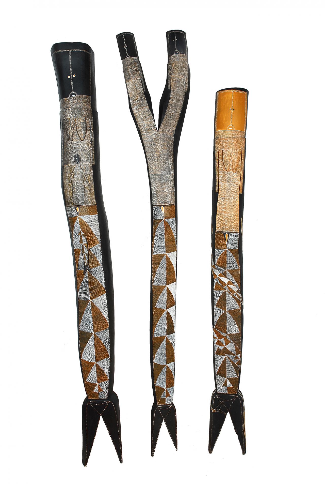 In 2010, Yalandja carved a monumental installation of three Yawkyawk spirits, Yawkyawk, 2010. The work is exceptional for its variation of form and precision of detail and shows the artist at the height of his powers, constantly challenging himself to increase the expressiveness, femaleness and physical presence of these young girl spirits. One is a fantastical androgynous double-headed form, exploiting the natural fork of the tree hollow to suggest a pair of Yawkyawk together in one place. Another, represented with sculptured breasts, is pregnant with an embryonic Yawkyawk developing inside her abdomen. The third is encircled by sinuous Yawkyawk spirits wrapping themselves around her female body.