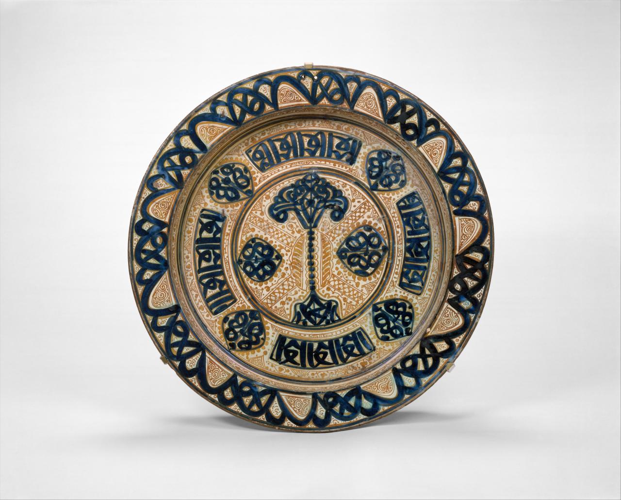 Calligraphic script was an important decorative device in the arts of the Islamic world and ornamental Arabic inscriptions had appeared on ceramics since the early Middle Ages. The importance of script as ornament was such that a phenomenon comparable to the pseudo-inscriptions developed, especially evident in regions where languages other than Arabic, the language of Islam, were traditionally spoken. Pseudo-Arabic inscriptions are found on textiles produced in early Islamic Egypt from the ninth century (see above).21Cäcilia Fluck, ‘Inscribed textiles’, in Helen C. Evans with Brandie Ratliff (ed.), Byzantium and Islam: Age of Transition, Metropolitan Museum of Art, New York, 2012, pp. 183–5. A tenth-century CE bowl from Nishapur in Iran bears an ornamental Kufic inscription that is so stylised as to border on illegibility, but remains possessed of great ornamental power (see above). Similar ornamental inscriptions occur on ceramics produced in Christian Valencia in early modern Spain where lustre-glazed pottery, produced in imitation of both imported Islamic ceramics and ceramics produced in Malaga in the Muslim Kingdom of Granada, often features Kufic and pseudo-Arabic script as decoration. A plate produced in c. 1430 for the Florentine Dazzi family, probably in Manises, is decorated with a central palm tree motif surrounded by reserves with a repeating al-afiya motif – a stylised shorthand of the Arabic word for ‘health’ and ‘happiness’ (see below).22Xavier Dectot, Céramiques hispaniques (XIIe-XVIIIe siècle), Musée National du Moyen Âge – Thermes et Hôtel de Cluny, Paris, 2007, pp. 35–7.