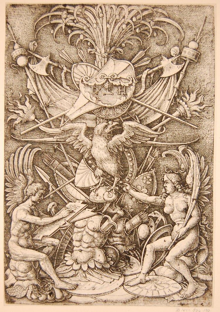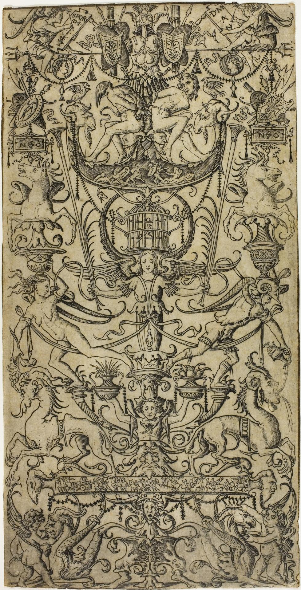 Many of the individual motifs employed in the grotesque ornament on the NGV bowl are typical of the trophy, an iconographic device depicting objects associated with the spoils of war, which was employed to convey ideas of triumph or victory. Timothy Wilson suggests that the grotesque decoration on this bowl, and a small number of other maiolica works that may be by the same hand or workshop, are reminiscent of ornamental prints by Nicoletto da Moderna.3Wilson, p. 79. An early sixteenth-century engraving by da Moderna bears out this observation, with its depictions of shields, braziers, cornucopia and a central winged figure (see below).