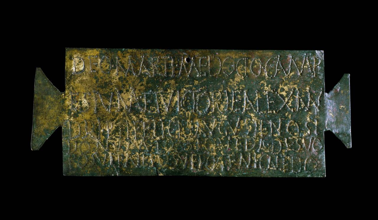 Of particular interest is the presence of two winged figures recording inscriptions on tablets on the upper right and left of a trophy of armour and shields. The form of these tablets – known as tabula ansata, or winged tablets for the triangular ‘wings’ projecting from their short sides – mirrors the tablets bearing strange inscriptions on the NGV maiolica bowl. In the engraving, the inscriptions on the tabulae are in Latin script and include the Senatus Popolusque Romanus (SPQR) – the Senate and People of Rome, emblematic of the government of the Roman Republic. The tabula ansata was employed since the time of Imperial Rome to frame votive inscriptions.4Elizabeth A. Meyer, Legitimacy and law in the Roman world: tabulae in Roman belief and practice, Cambridge University Press, Cambridge, 2004, p. 28. The text on such a tabula was set off as possessed of importance – a dedication to a god (see below); the name of a military unit;5For example, E. Campomanes Alvaredo, ‘Obras Hidráulicas en el Campamento de La Legio VII Gemina (León)’, in I. Moreno (ed.), Nuevos Elementos de Ingeniería Romana. Actas III Congreso de Las Obras Públicas Romanas I, Junta de Castilla y León, Consejería de Cultura y Turismo, Salamanca, 2006, pp. 199–201. a memorial to a deceased person;6For example, George A. Bevan & M. Barbara Reeves , ‘A new Nabataean funerary inscription from Humayma’, Journal of Semitic Studies, vol. 55, issue 2, 2010, pp. 497–597. a blessing.7For example, Leah di Segni, ‘An inscription from Khirbet el-Jiljil’, Bulletin of the Anglo-Israeli Archaeological Society, vol. 23, 2005, pp. 101–5. The tabula ansata retained such functions in the early modern period. An engraving by Daniel Hopfer of a trophy flanked by seated figures of History and Victory shows History recording the glorious deeds of the victor upon a similar tablet form (see below). If the use of a tabula ansata draws attention to a significant text, then what is to be made of the inscriptions on the NGV maiolica bowl? Executed in pseudo-script, the text is illegible; however, the use of the tabula suggests it is important.