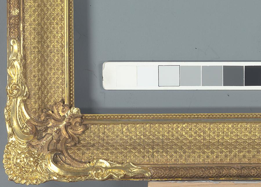 Conservation treatments begin with examination and testing to gain an understanding of how the frame was made, the materials of which it is composed, and the condition. In a general sense both the Short and Brozik frames are similar with a wooden structure, applied ornament, and a gilded finish. However, in terms of materials, there are distinct differences between the two frames. The ornament on the frame for the Short is composed of composition (also known as compo)*A mouldable material used to produce decorative ornament for picture frames. Compo was used extensively in picture frames from the late 18th century, and along with cast plaster, largely replaced hand carved ornament in the 19th century. Recipes vary but it is generally comprised of chalk or gypsum mixed with linseed oil, rosin, and animal glue. When warm, compo has a dough-like consistency and can be pressed into rigid moulds. The material stiffens on cooling but can be re-heated to so that it is pliable for positioning on the frame. , a glue-based material that is pressed into moulds to create the design. Whereas the ornamental forms on the Brozik frame are made from plaster of Paris, which is mixed with water to create a slurry that is poured into decorative moulds. Both materials were widely used during the 19th and 20th centuries both locally and internationally.