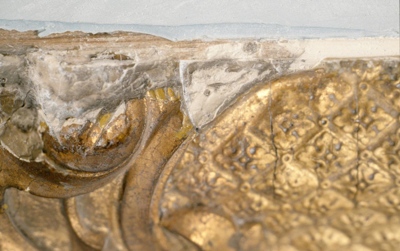 The new fills were sealed and then gilded using gold leaf and a synthetic gilding technique. The benefit of using a non-traditional gilding system is the new gilding can be more easily removed without affecting the surrounding historic surfaces in the future. Likewise, the new varnish layers used to tone the bright gilding were carefully chosen for reversibility, in-line with conservation ethics.