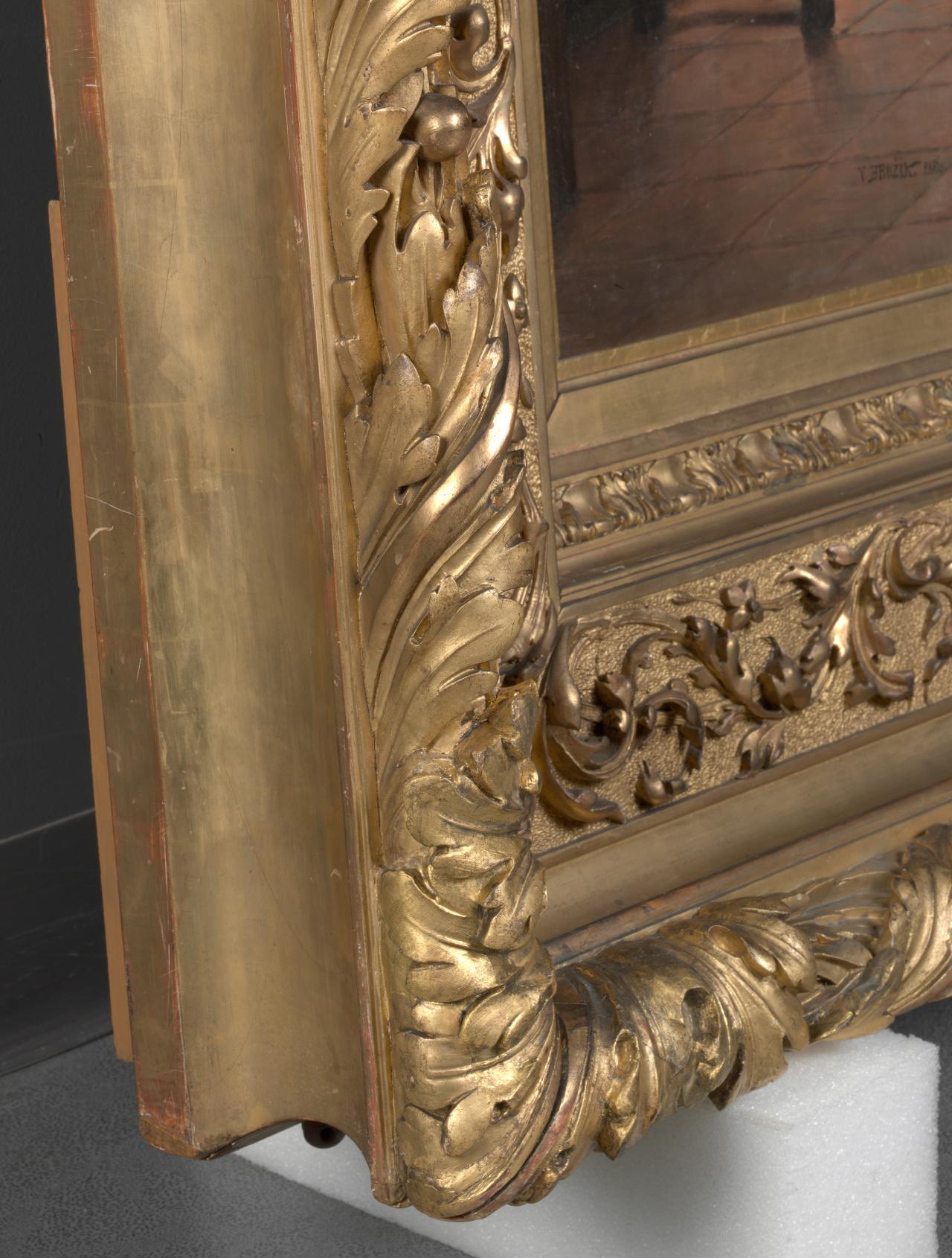 Detail of the bottom corner of the Brozik frame showing loss and detachment of plaster ornament.