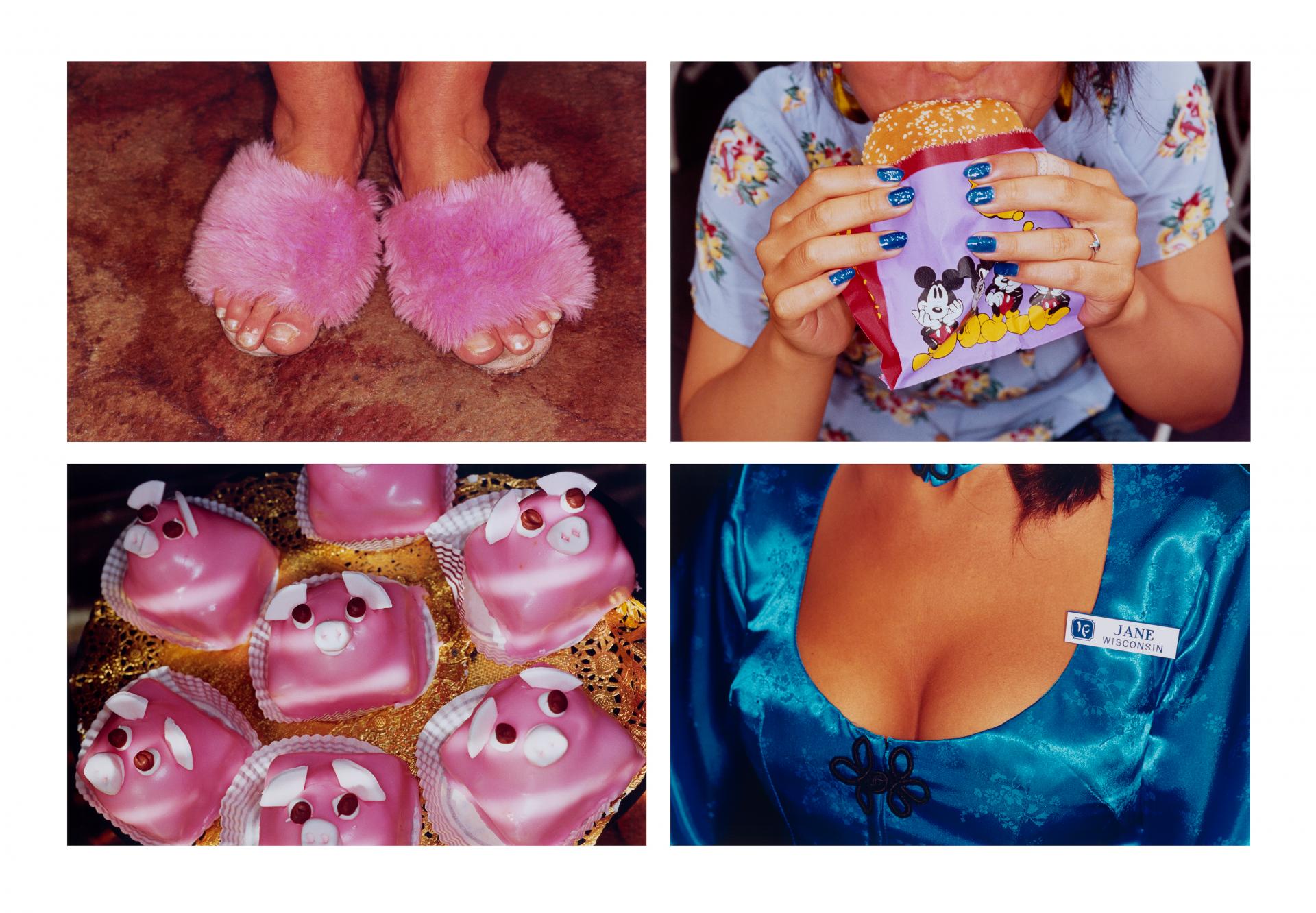 Parr’s photographs are at first glance bright and cheerful details of everyday life but the use of extreme close-up, sharp focus and strong lighting reveal the insidious artificiality of the subjects. Common sense 7 shows a close-up of a woman’s feet enclosed in pink, fluffy slippers. But her exposed toes have chipped and dirty nails, the soles of the slippers are worn and she is standing on a brown carpet. The badly manicured feet and carpet act as an uncomfortable contrast to the garish slippers, which seem both excessive and amusing. Equally comical is the dramatic close-up of a woman’s cleavage in Common sense 67. We know her as Jane from Wisconsin, as indicated by the nametag that she is wearing. The shiny blue satin of her dress creates a play of light that accentuates the curve of her breasts, and the extreme closeness of the image amplifies a sense of intrusion, although it’s not clear who is intruding on whom.