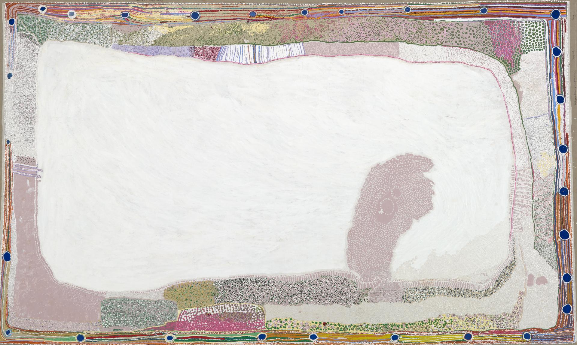 Ngayartu Kujarra (Lake Dora), an immense warla (salt lake) of glittering whiteness, has a palpable presence in Punmu community. It looms large in the psyche of Martu people who were taken away from Punmu to Jigalong mission and worked on pastoral stations during the 1960s and have relished the return to their homeland. This warla of blinding whiteness, an eccentricity of natural geography, has inspired twelve Martu women artists of three generations to express viscerally their profound affection for it and the surrounding water sources.