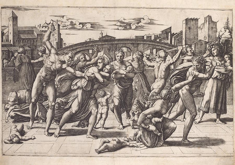 Marcantonio arrived in Rome in 1510 or 1511, and shortly thereafter began a long and productive association with Raphael. Over the ensuing decade he made about fifty engravings after Raphael’s designs. Unlike later reproductive engravers, Marcantonio worked not from Raphael’s finished paintings but rather from the master’s drawings. There is strong evidence to suggest that Raphael occasionally made drawings specifically for Marcantonio to translate into engravings. Massacre of the Innocents is the most famous example of this, and the great care with which Raphael developed the composition is revealed in six extant drawings. The compositional details of the terrified, fleeing women and the executioners intent on their gruesome task are fully resolved in these drawings, although, surprisingly, not one of them shows the elaborate cityscape (which has been identified as a view in Rome) that features in the engraving. It is uncertain whether a further, now lost, drawing provided these details, or whether Marcantonio, in accordance with his established practice of combining various sources in his engravings, provided the background himself.