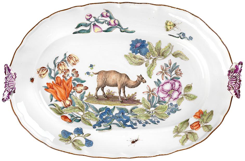 The Meissen Porcelain Factory, founded in 1710 in the town of Meissen, Germany, by Augustus II, ‘the Strong’, King of Poland and Elector of Saxony, was the first European manufactory to master the creation of true hard-paste porcelain. Grand dinner services in Baroque style were an important part of the factory’s early output. This pair of porcelain stands, probably intended to sit under small tureens, was part of such a service and is decorated in poly-chrome enamels with sprigs of flowers, insects in the so-called ‘ombrierte’ (shadowed) style and garlands of flowers tied with blue ribbons executed in a naturalistic style derived from botanical woodcuts. The centre of the well of one stand is painted with an image of a mountain goat eating foliage, while the well of the other stand bears a painting of a camelid of some variety, probably a llama.