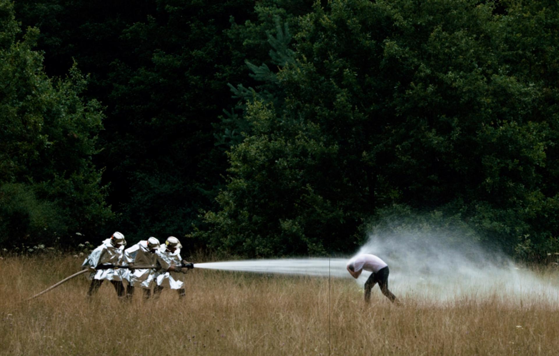 Jane Devery: Ensemble is a relatively short but intense video installation that depicts an epic feat of physical strength and protest. Set in a verdant landscape three firemen move into frame and prepare to turn on a water hose. We watch as the men lean into, and against, the elemental force of the jet of water. After a period of time, a lone man moves into frame and walks improbably against the extreme force of the hose. Against all odds, he pushes forward and the other men begin to retreat. What drew you to this subject?