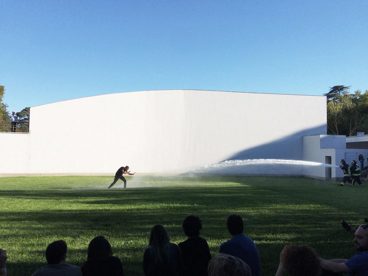 MO’C: The performance at the Serralves came about when the curator saw the video, Ensemble at the Pompidou Centre, Paris in 2016 and proposed that I present it as a live performance in the grounds of the museum for the exhibition, ‘Museum As Performance’. The long format of the museum itself is spectacular and not unlike the 32:9 format of the video. It gave me the opportunity to use the architecture of the building to create the divide, the psychological threshold.